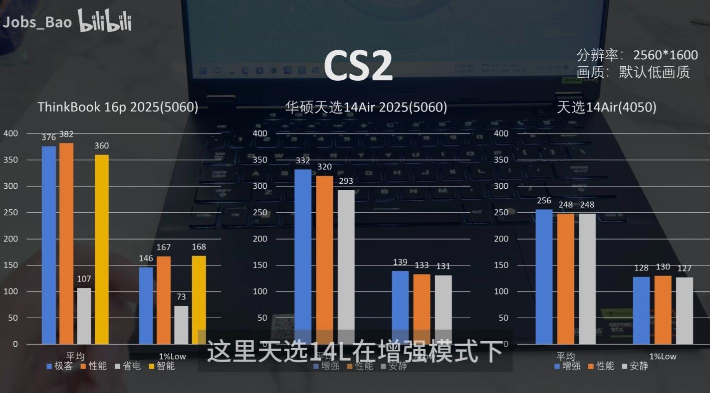 落到实际的游戏体验上,UP主的测试也给了我们参考。在《CS2》的测试中,增强模式下能达到平均帧330帧、最低帧139帧的流畅体验,与搭载满血5060的游戏本差距极小。而在《怪物猎人:荒野》的测试中,其在不同功耗模式下的帧数表现都相当出色,甚至在增强模式下帧数表现优于部分满血5060机型,展现出良好的优化能力。