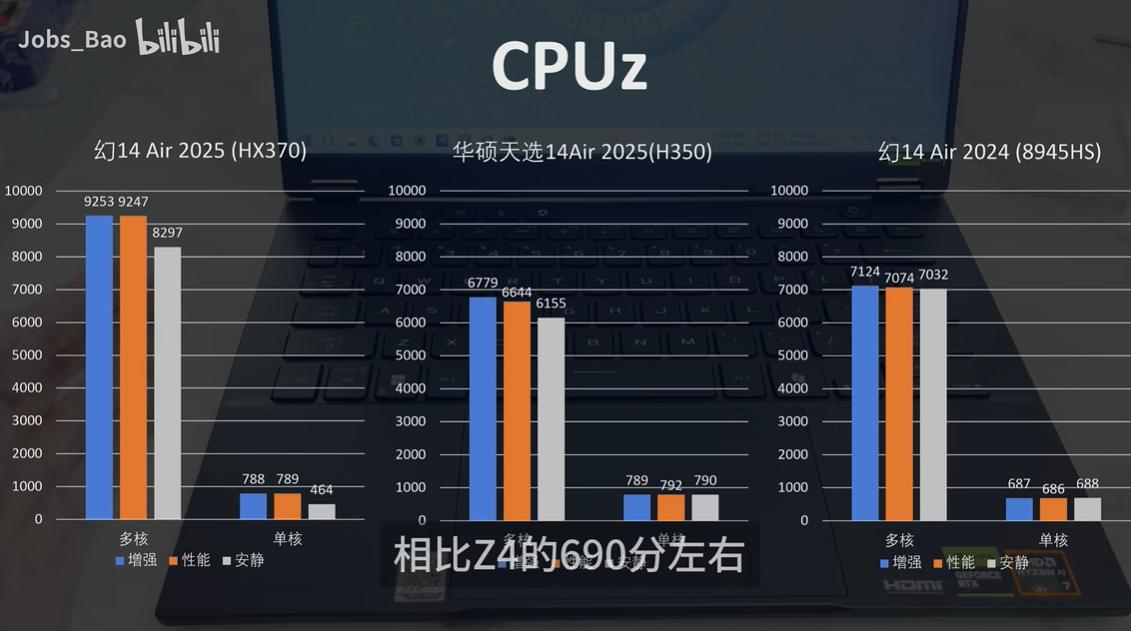 天选Air 2025搭载AMD锐龙AI7 H350处理器,采用全新的Zen5架构,加速频率至高可达5.0GHz。显卡方面则升级至RTX 5060,辅以32GB内存和1TB SSD的大容量高速存储组合,为强大性能奠定了硬件基础。在UP主的实测显示,其单核性能表现优秀,达到约790分,并且在如Cinebench R23等长时间负载测试中,凭借优秀的能耗比表现优于上代的8945HS处理器。