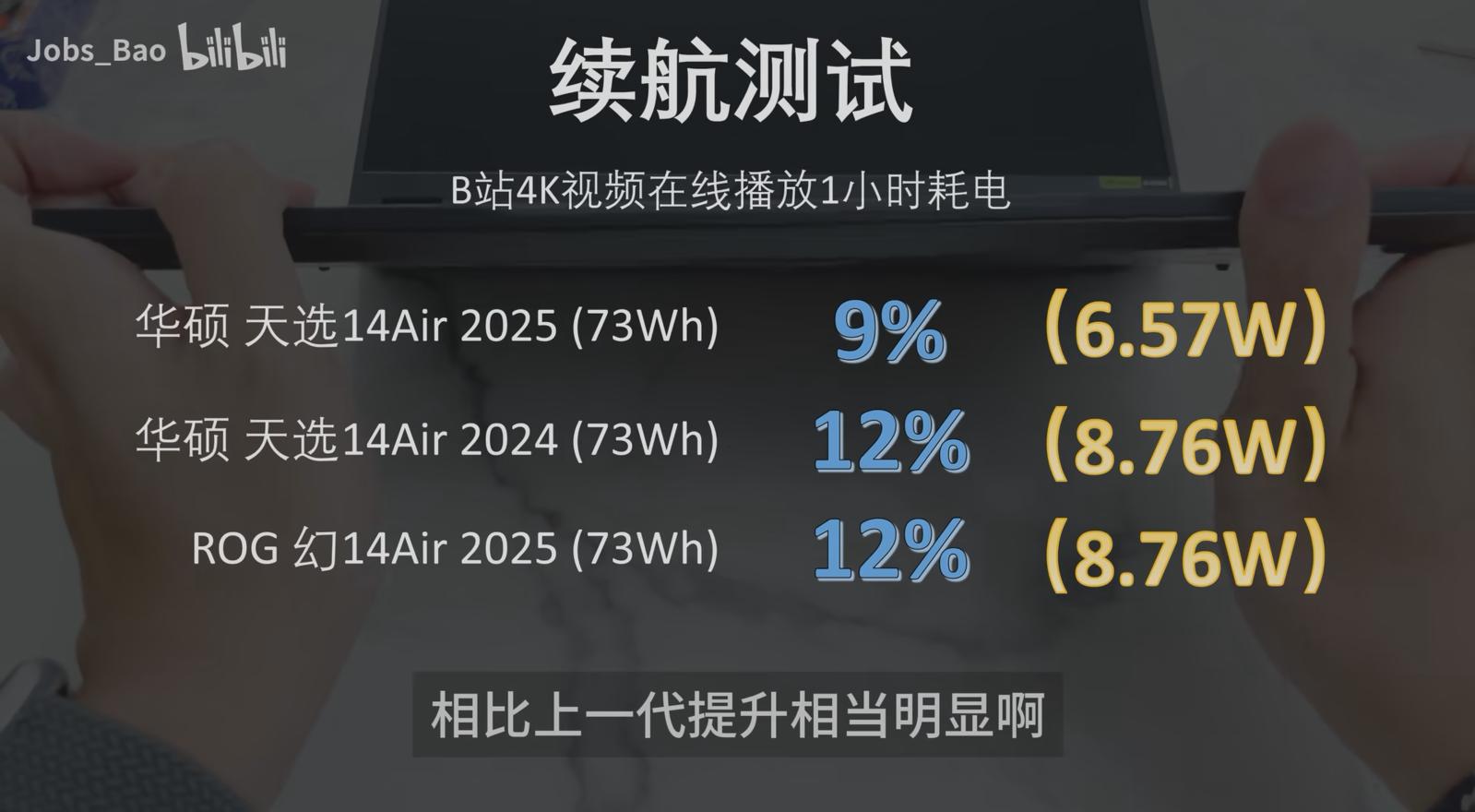 续航能力的显著提升是天选Air 2025的又一大亮点。它配备了73Wh的大容量电池。在B站4K视频在线播放的实测中,1小时耗电量仅为9%,这意味着满电状态下可连续播放视频约11小时,相比上一代产品约8小时的续航能力,提升了接近30%。在PCMark现代办公续航测试中,其极限续航时间更是达到了15小时。