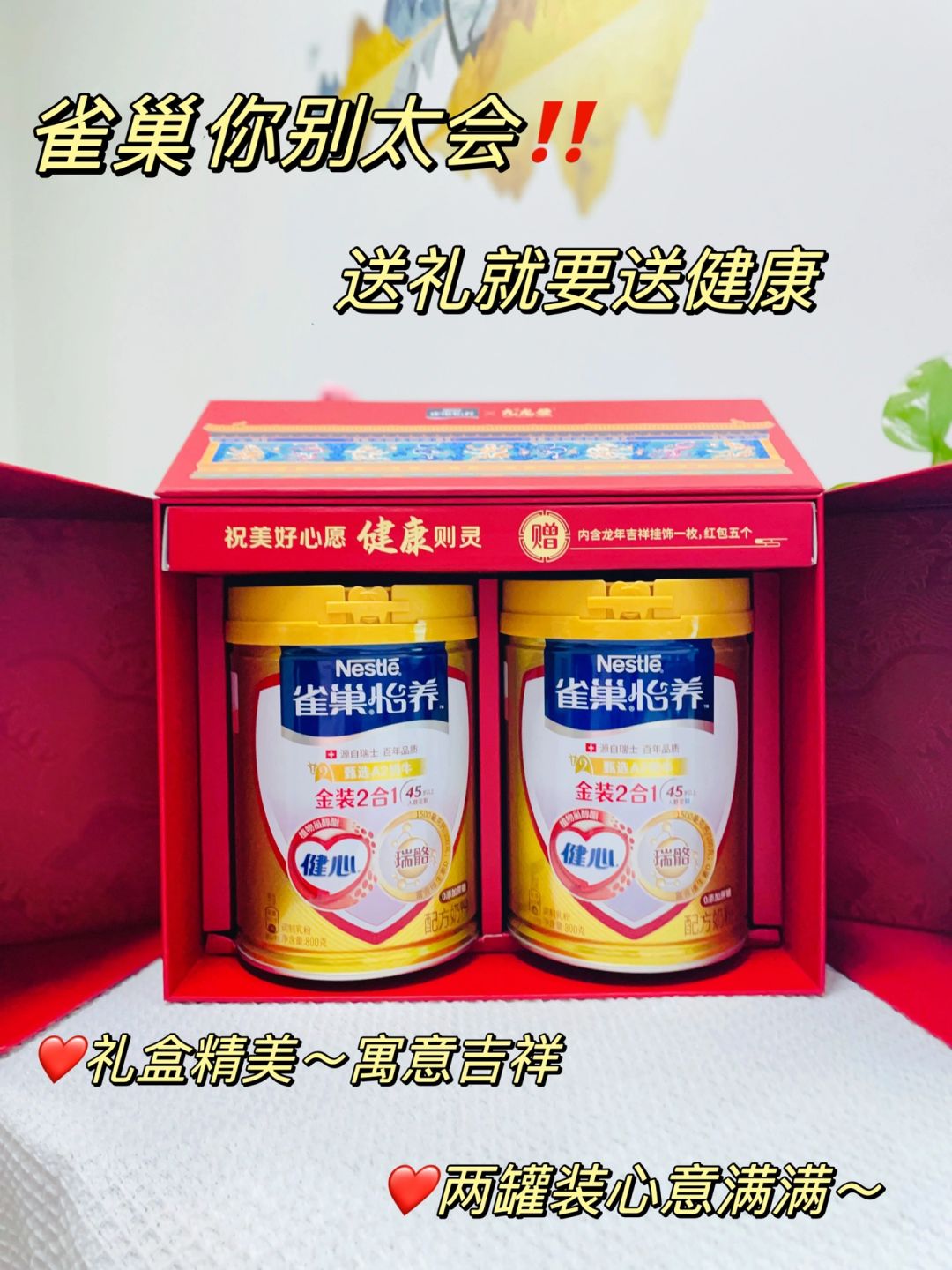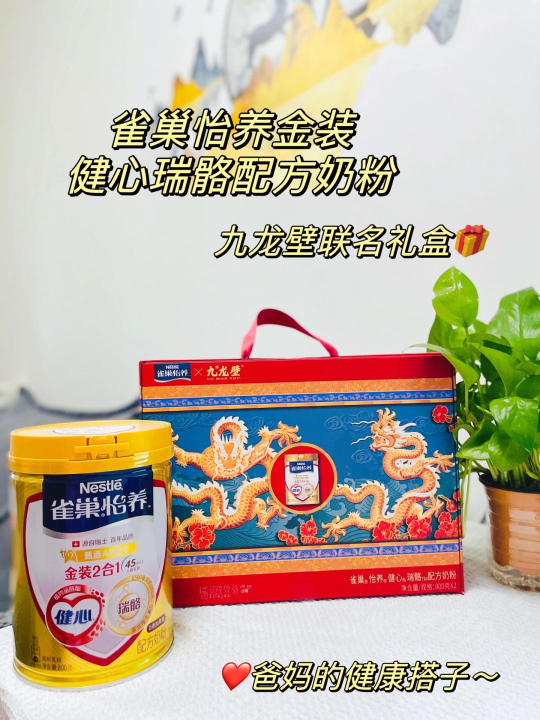 [派对R]而且这款奶粉有自然香甜的奶味,粉质细好冲泡,我爸妈现在是每天都会喝两杯。跟九龙壁联名的新年礼盒也特别喜庆吉祥,家里老一辈应该都抗拒不了,拿出来贼有面儿!大家过年给长辈选礼物真的可以选这个!