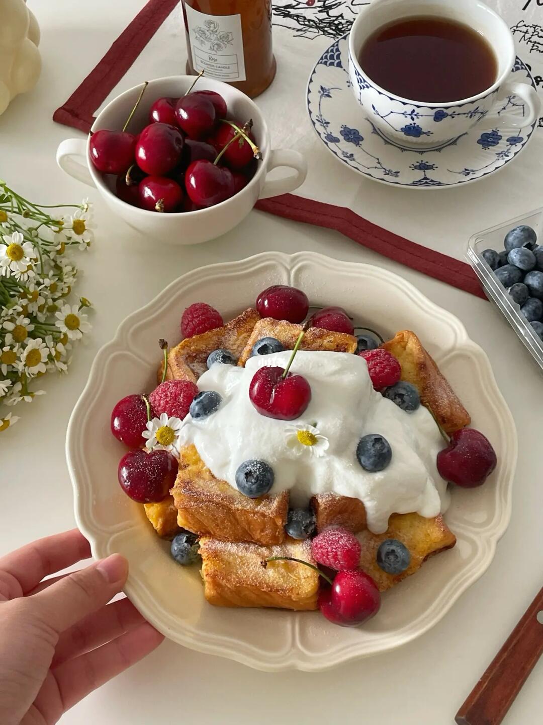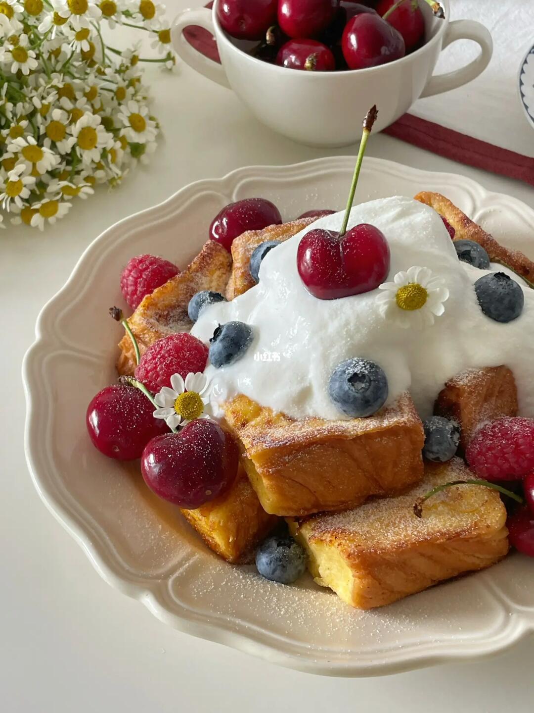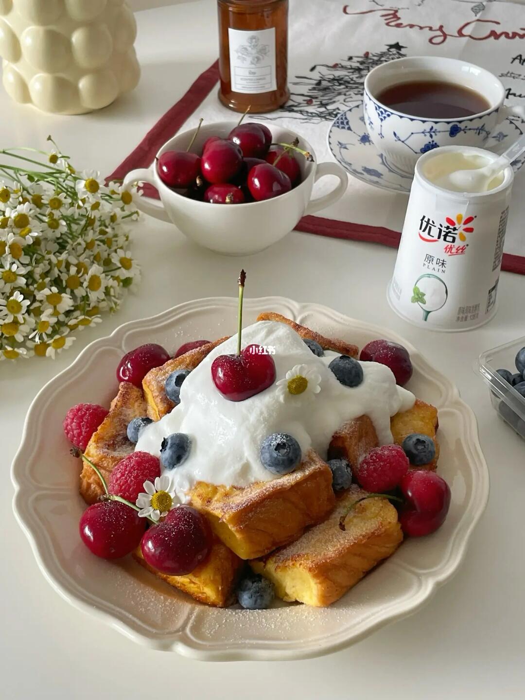 浸满蛋奶液的厚切吐司🧇用黄油煎香后淋上的法式酸奶🥛搭配上应季的车厘子和莓果🫐法式氛围感满满的一顿搞定喽🎄吐司香甜松软☺️车厘子饱满多汁🍒这个搭配锁住!