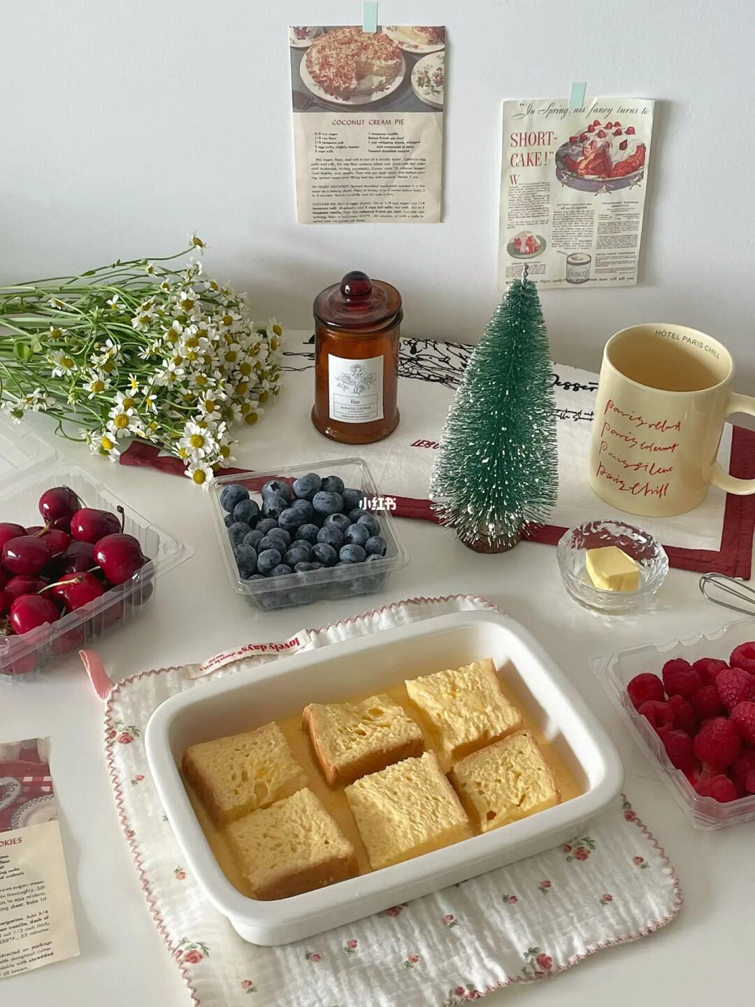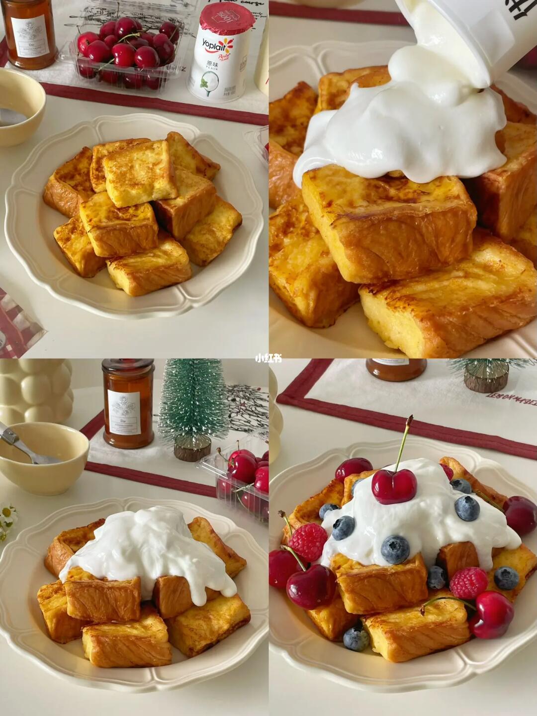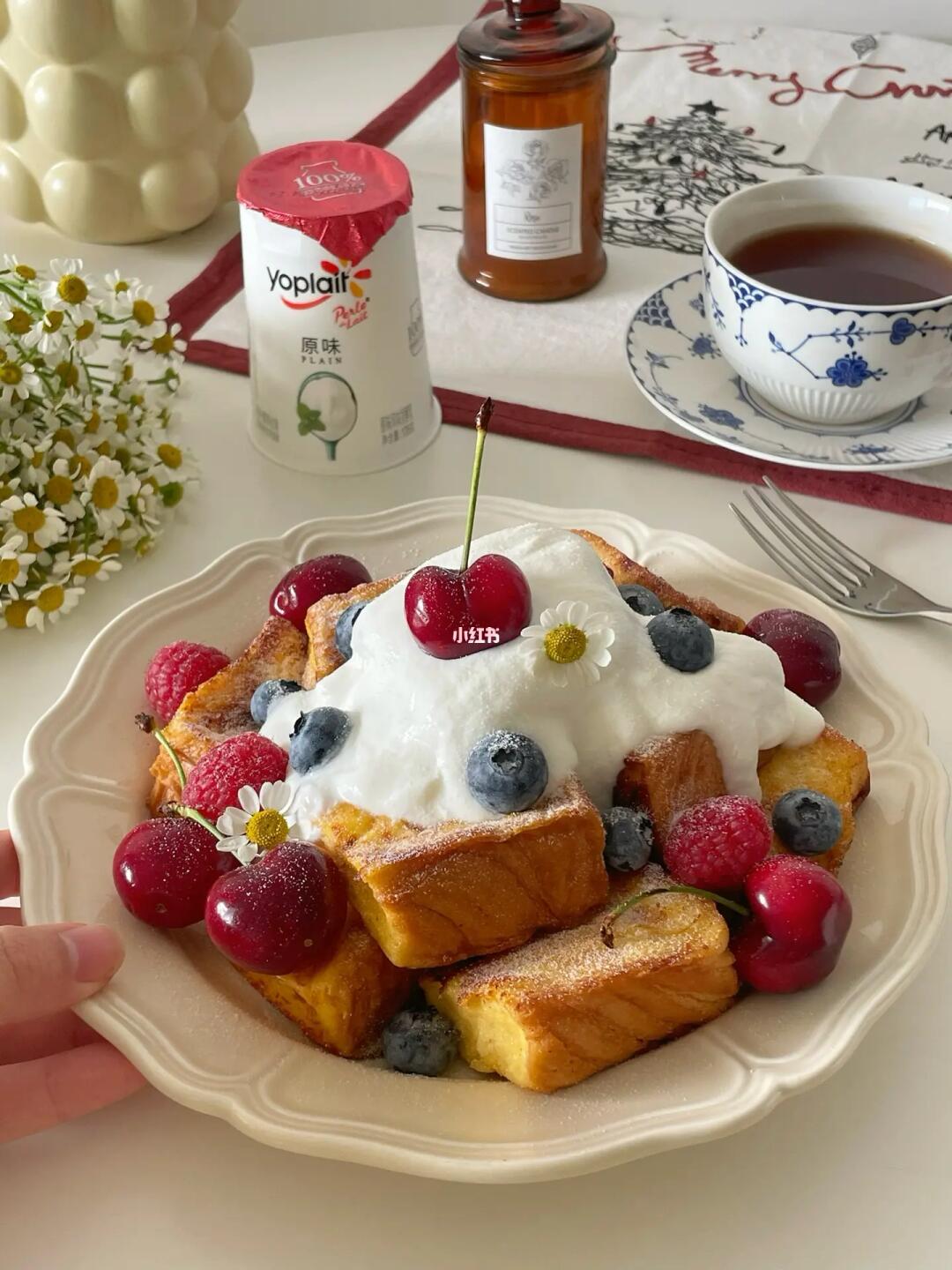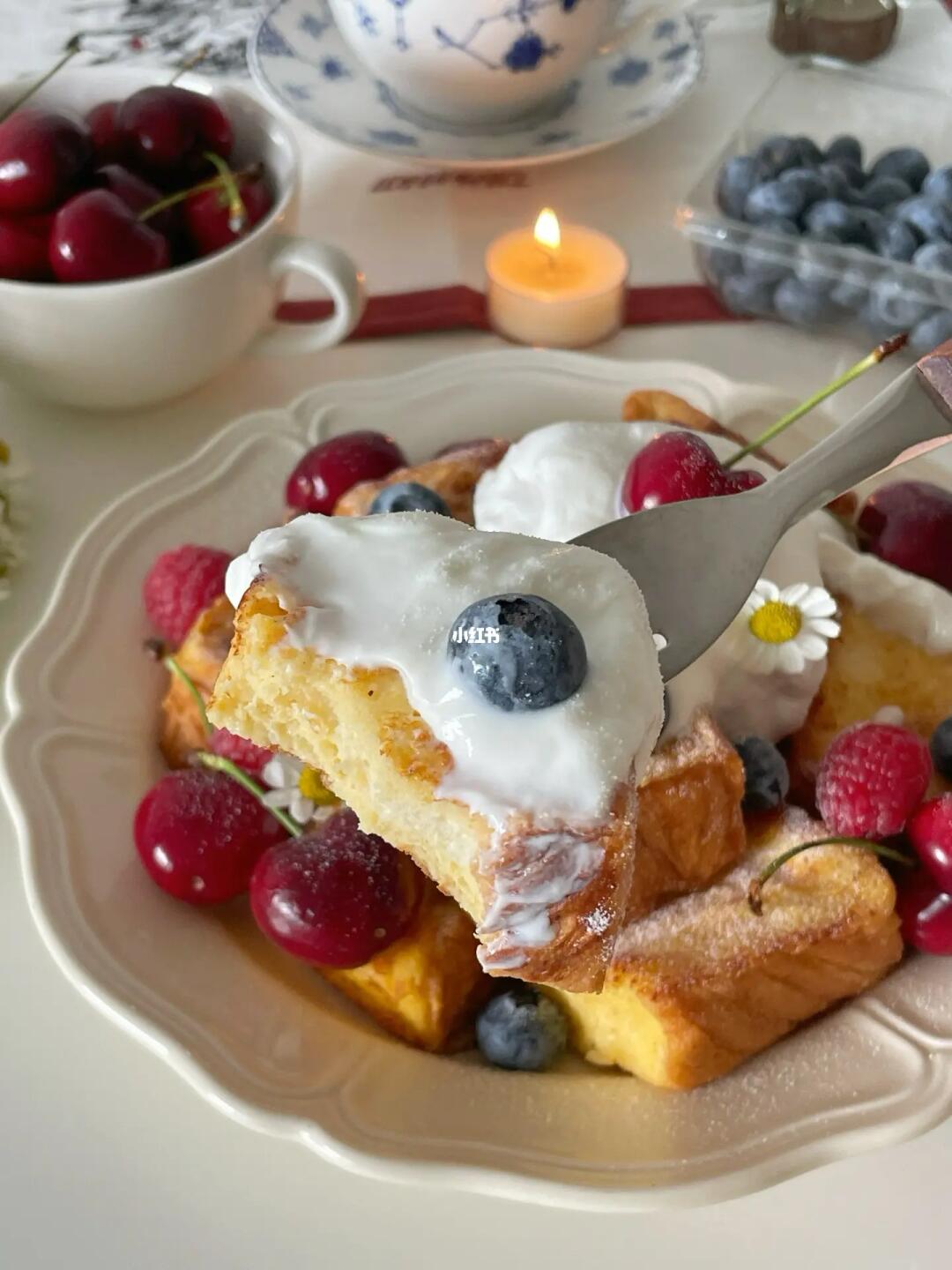 浸满蛋奶液的厚切吐司🧇用黄油煎香后淋上的法式酸奶🥛搭配上应季的车厘子和莓果🫐法式氛围感满满的一顿搞定喽🎄吐司香甜松软☺️车厘子饱满多汁🍒这个搭配锁住!