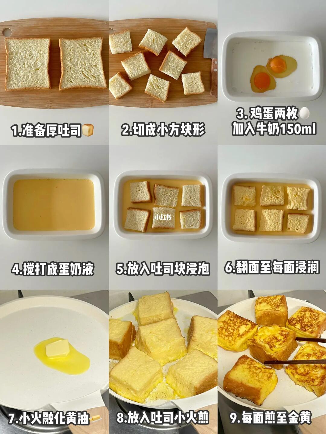 1️⃣吐司切成小方块,牛奶中加入鸡蛋,根据喜欢的甜度加一勺糖,搅匀充分浸泡吐司。