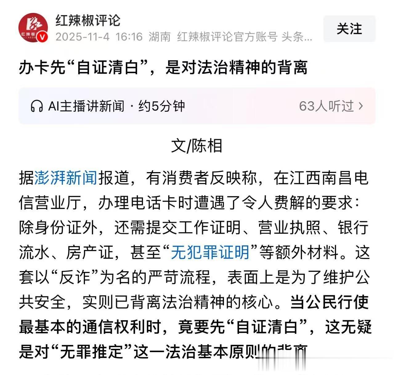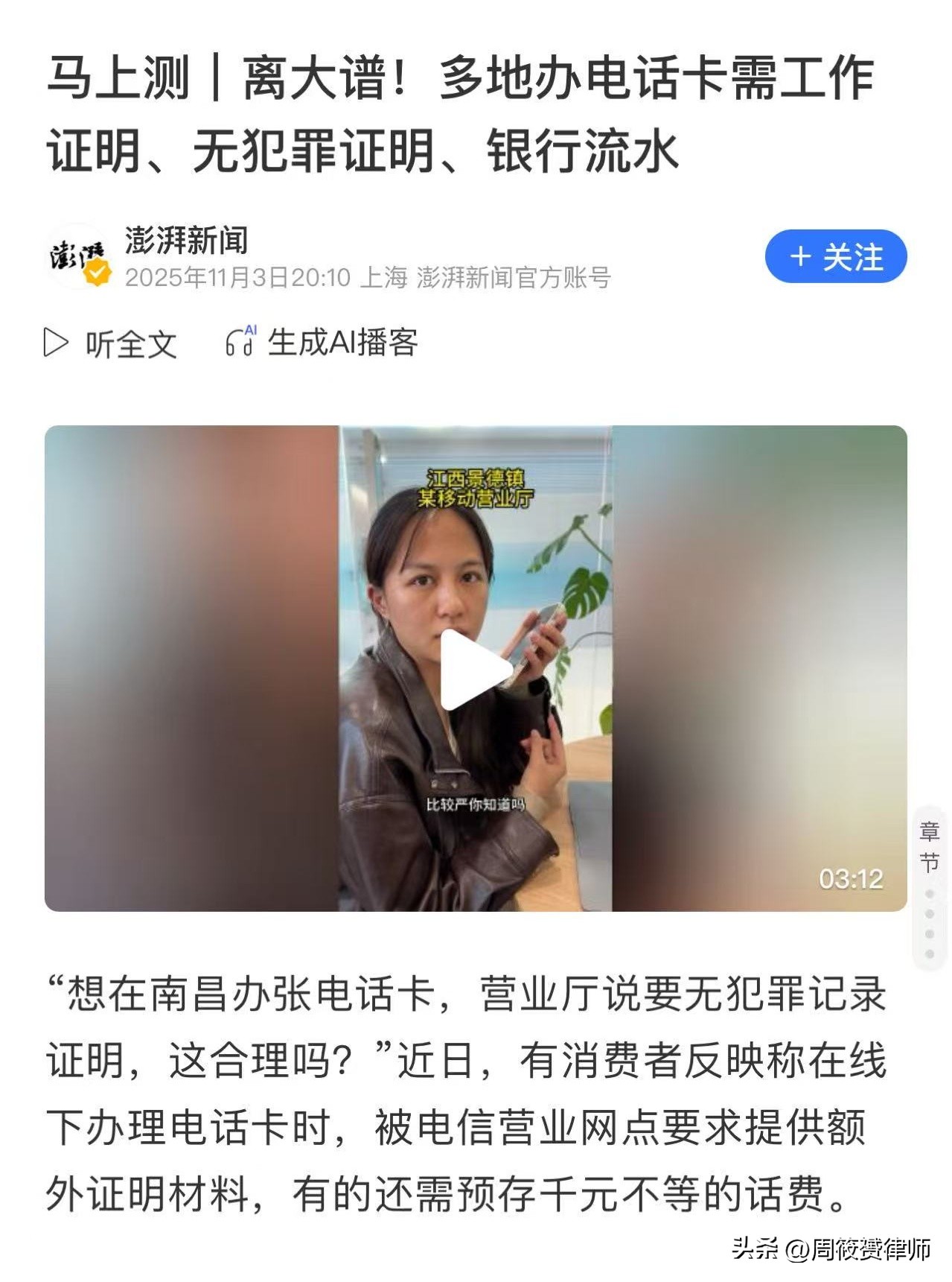 我听说,现在办银行卡、电话卡,更是难上加难!根据澎湃新闻11月3日的报道,多地办电话卡需要工作证明、无犯罪记录、银行流水等。理由还是冠冕堂皇的反诈。意思是有过犯罪记录的人,连手机也不能用了?为此,有媒体评论,办卡先“自证清白”,是对法治精神的背离。