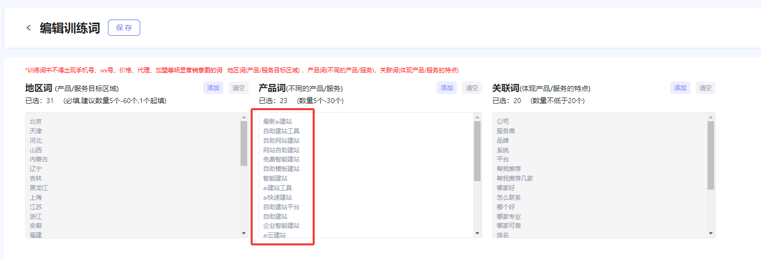 精准筛选关键词:围绕 “地区 + 产品 + 需求” 建库,优先选择 “搜索热度中等偏上、竞争度较低” 的长尾关键词(如 “地区+ AI 建站服务商”),降低初期优化难度;