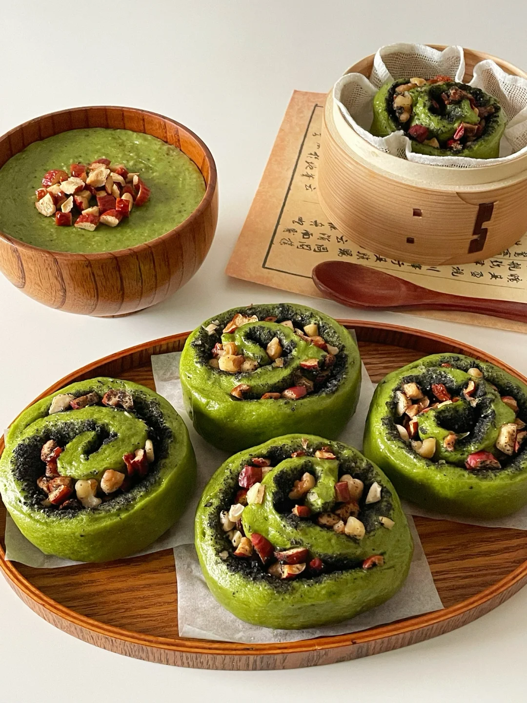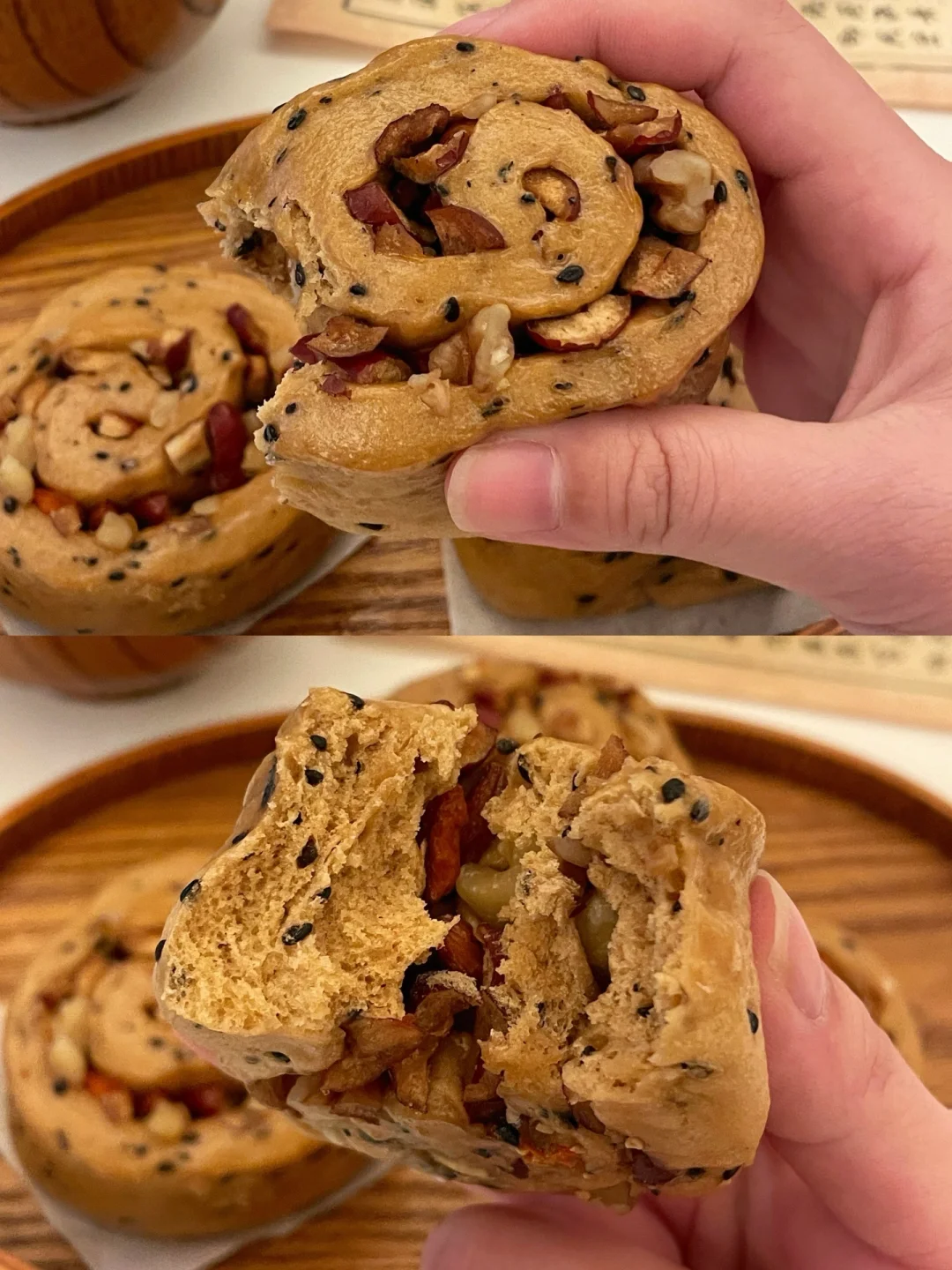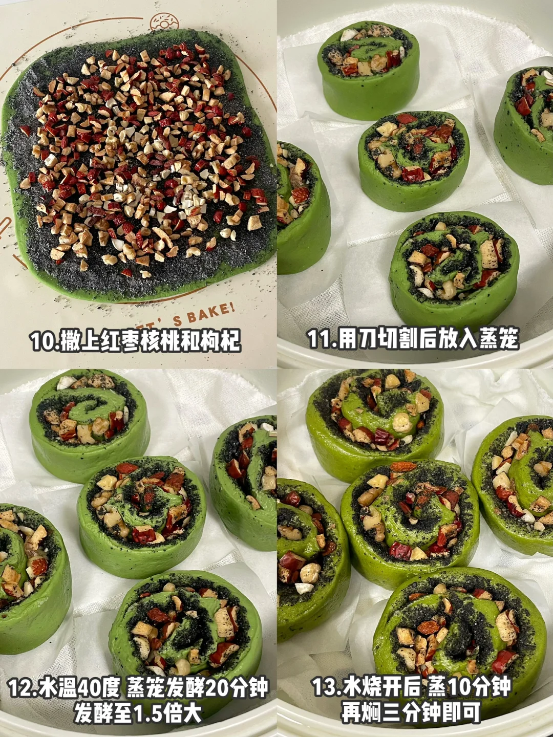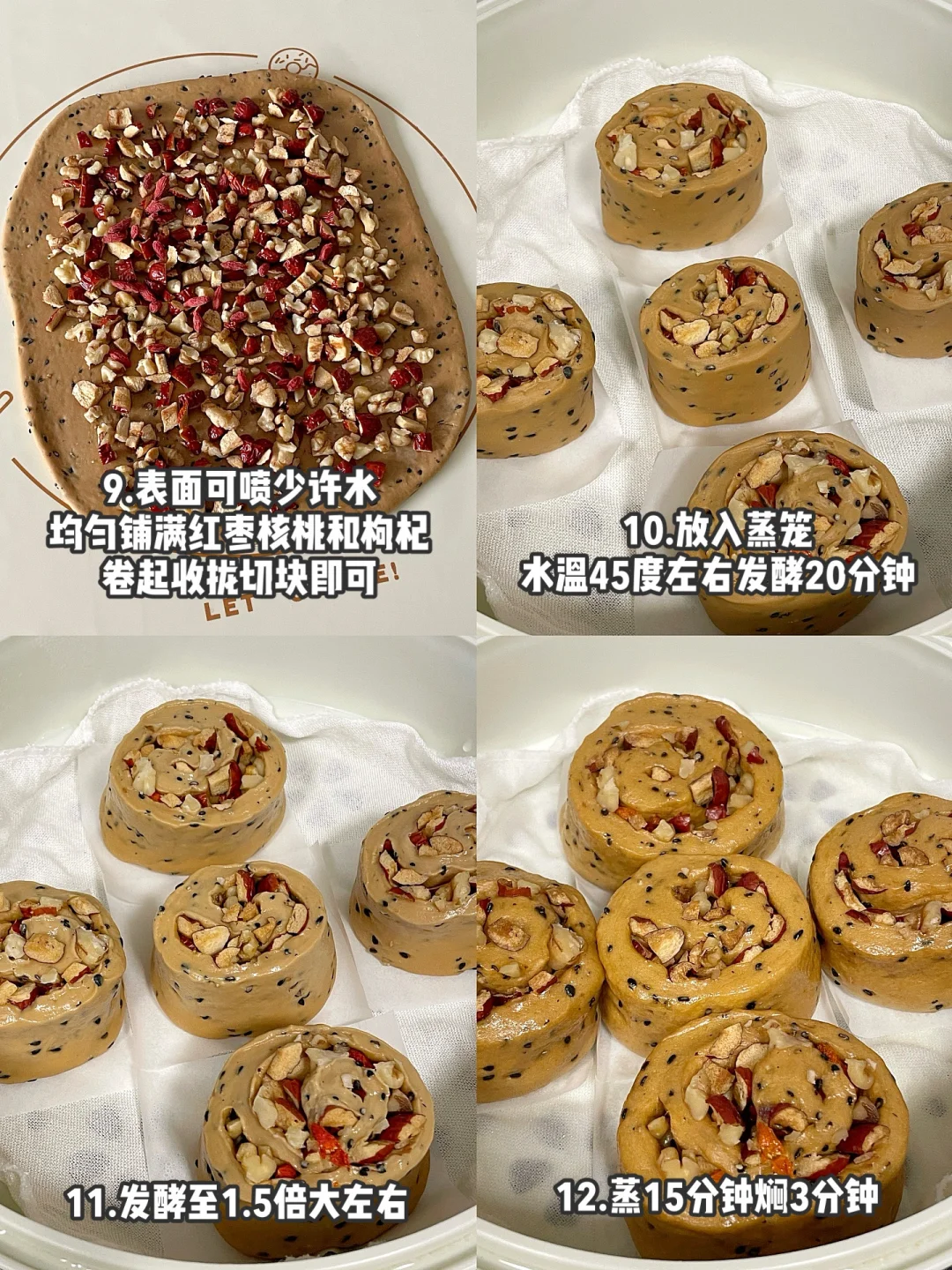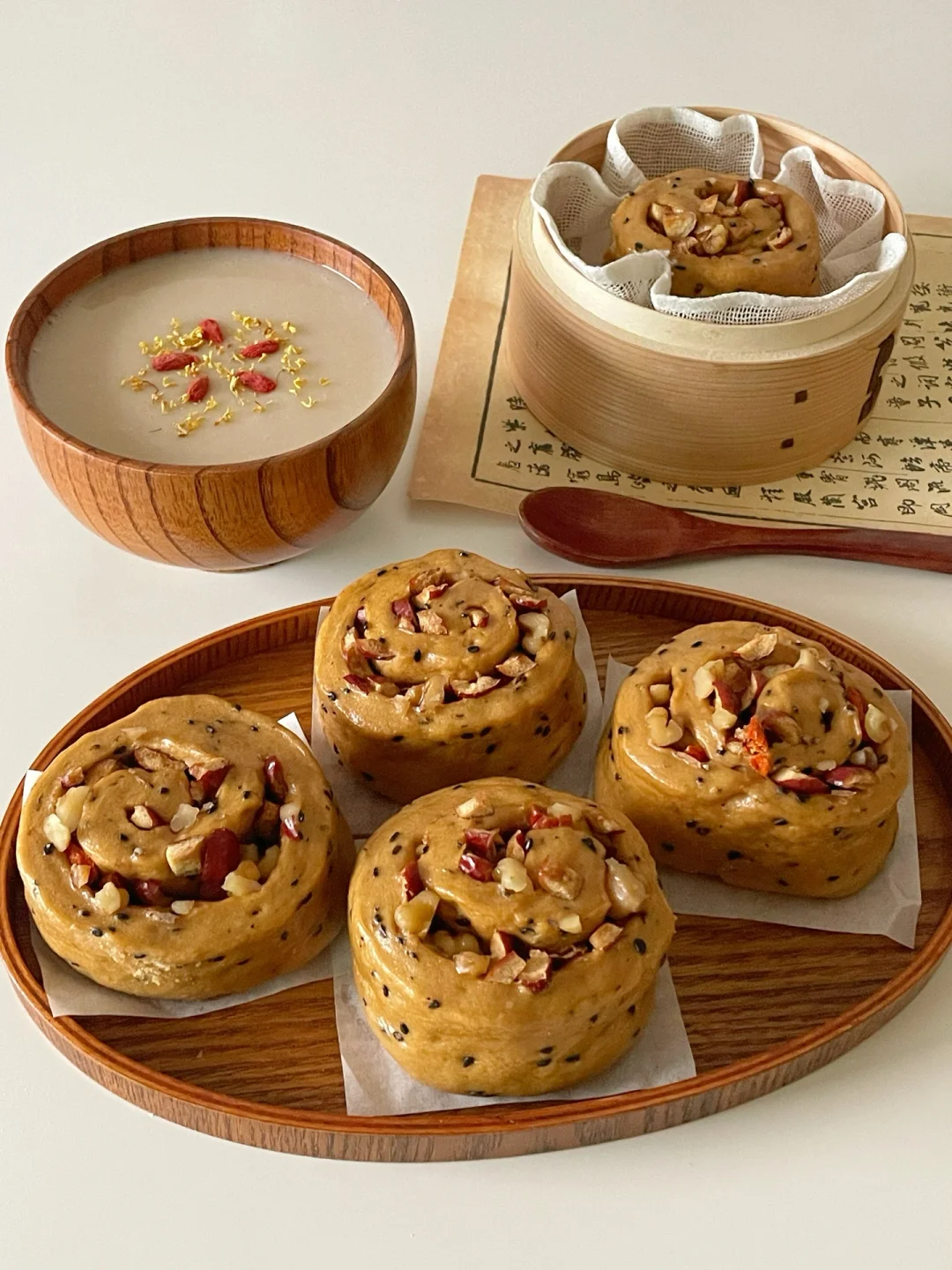 Hi👋朋友们👧🏻👦🏻~ 这个冬天爱上做馒头👩🏻🍳不知不觉又做了一些馒头卷!空闲时刻做一些馒头囤起来当早餐🥣工作日起床蒸上一两个🤤超方便嘟! · 1️⃣抹茶黑芝麻红枣卷➕抹茶燕麦粥 2️⃣黑芝麻红枣核桃卷➕黑芝麻糊 3️⃣南瓜枸杞蜜豆卷➕南瓜米糊 4️⃣红糖红枣核桃卷➕米稀 · 📝保存:密封起来冷冻保存,想吃的时候拿出蒸10~15分钟左右。 📝关于加入水的温度:冬天用温水,夏天用冰水,其余时候常温水即可。