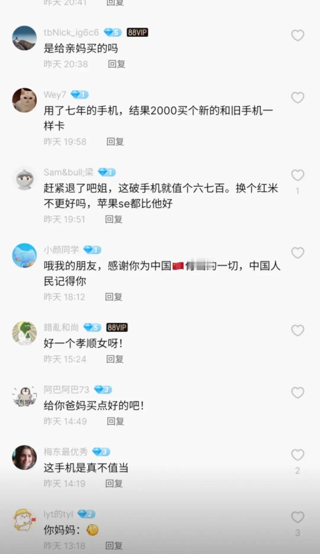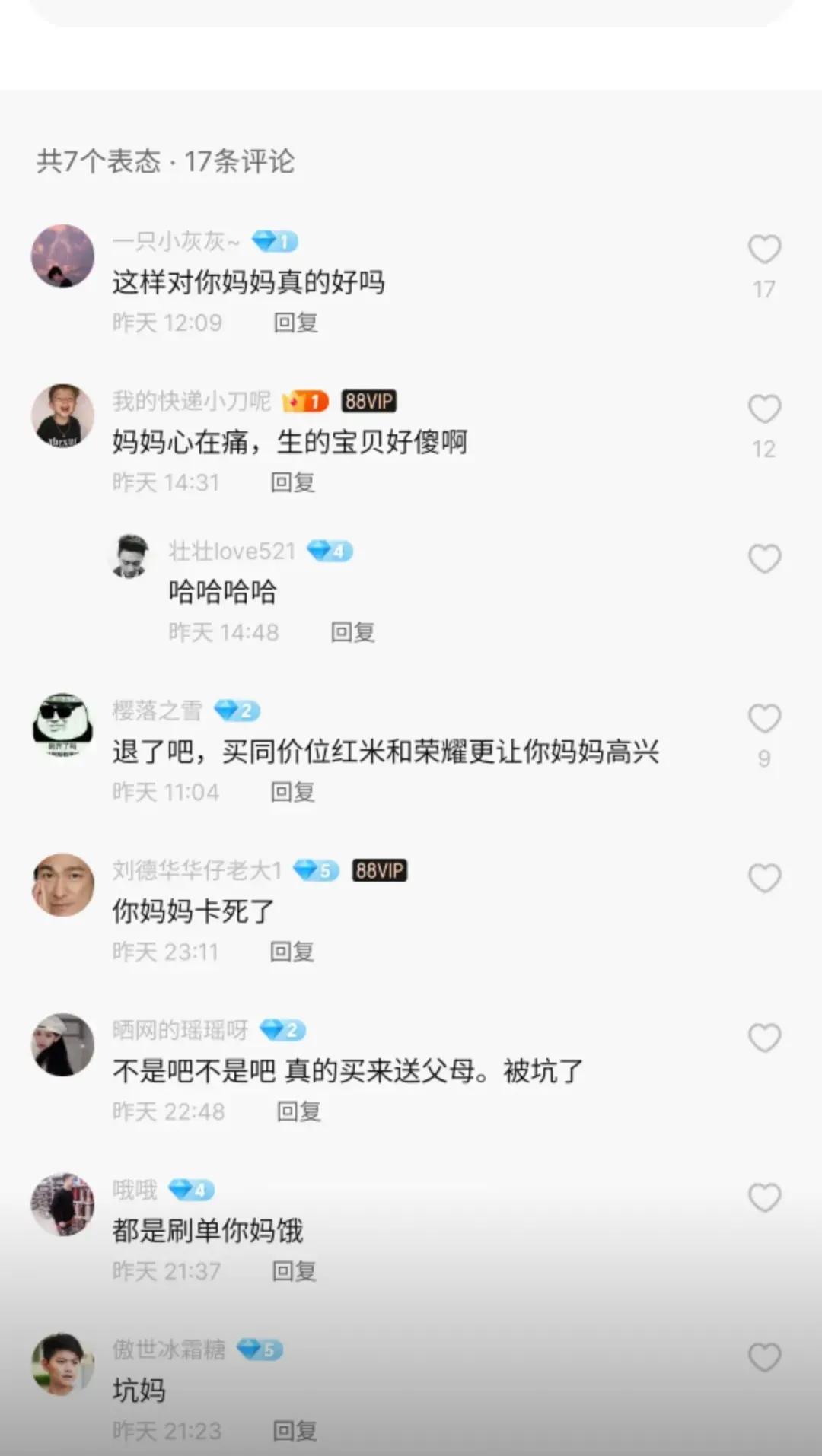 人家只是买个手机给她妈妈,哪怕这个评价是刷的?这个评论区也不应该这样吧?这机器的确不值,无论是陌生人还是熟人,我都不推荐购买,但如果别人一定要买,我们又又有什么理由让人不买,还对人家冷嘲热讽,有的时候还是要撞到墙才会回头的。#评论区晒图挑战赛#