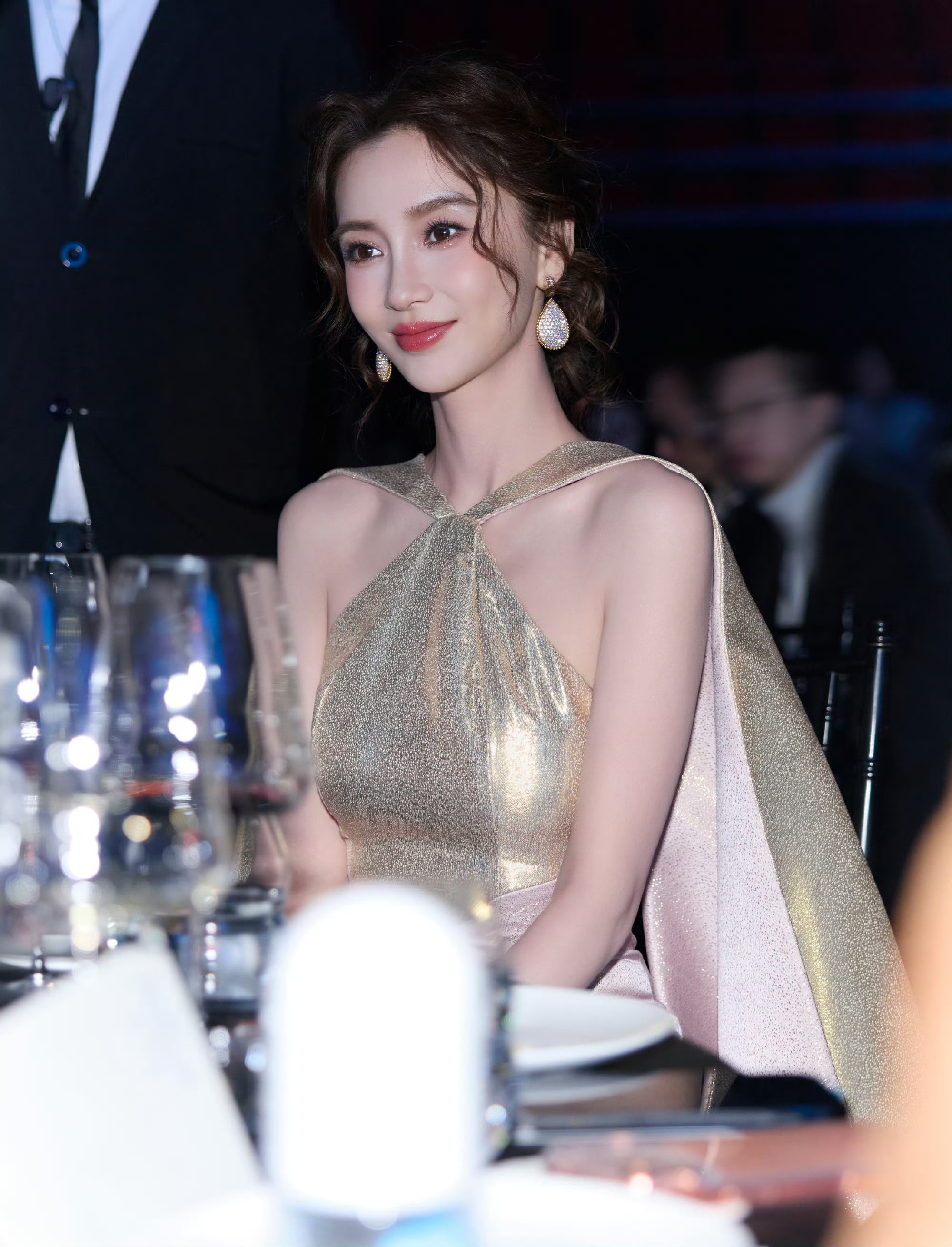 杨颖鎏金挂颈连衣裙,美得闪闪发光