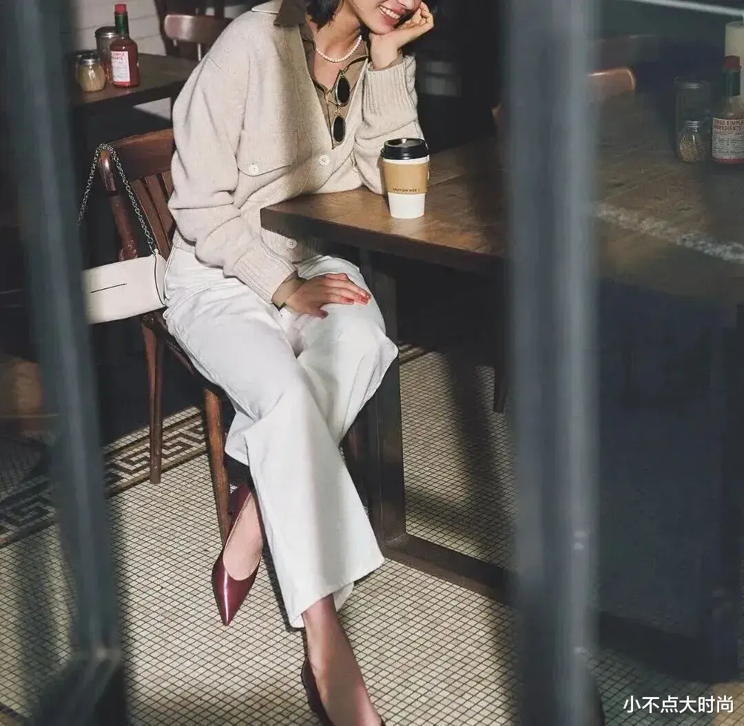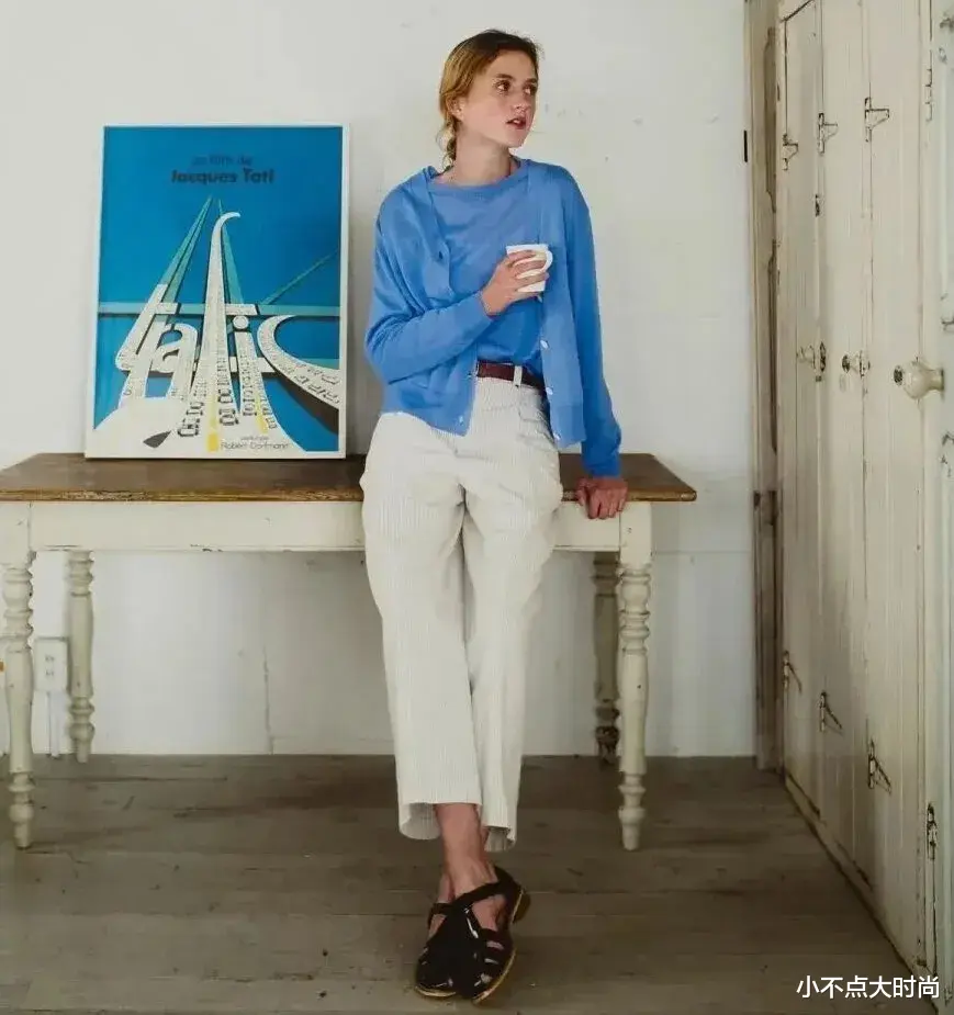 白色的高腰九分直筒裤搭配蓝色的针织开衫,内搭也是蓝色的,沉静又高级。九分直筒裤修饰腿型,既显高又显瘦。整套蓝白搭配清冷克制又有针织的温柔气息,时髦又高级。▼