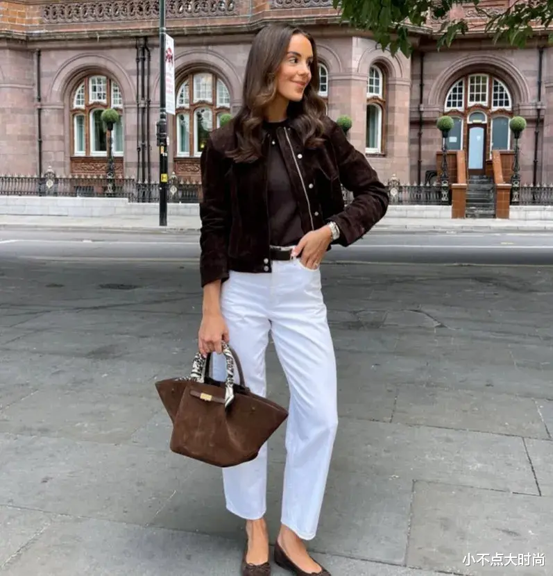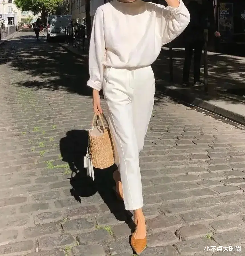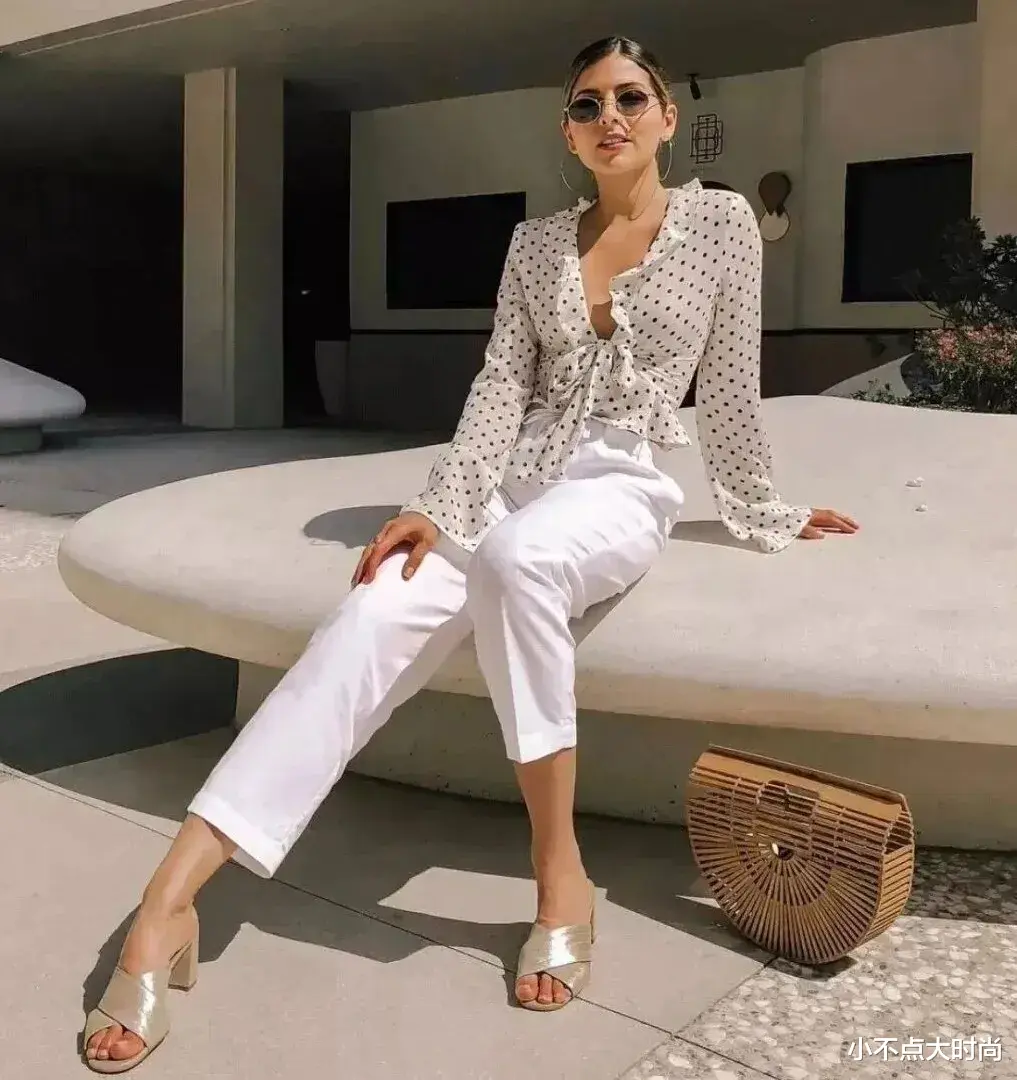 白色的高腰九分直筒裤搭配白色的波点衬衫,既有通勤利落感和气质,又有法式风情的浪漫优雅。白色系搭配协调显高、干净有高级感,波点元素增添可爱小趣味,时尚感十足。▼