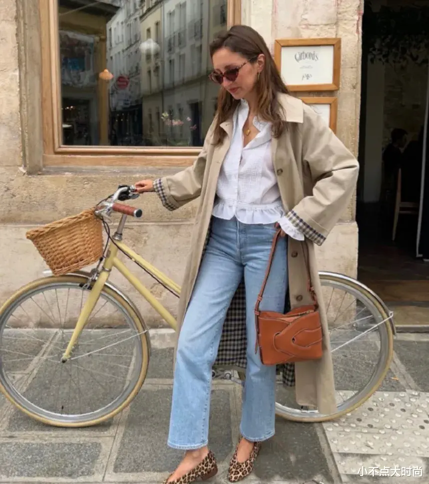 高腰的九分牛仔直筒裤搭配风衣外套也很经典,有秋天电影氛围感的穿搭。内搭白色小衫有可爱的小花边,增添细节浪漫元素。豹纹小单鞋增添时尚趣味,让搭配更别致,经典耐看又与众不同。▼