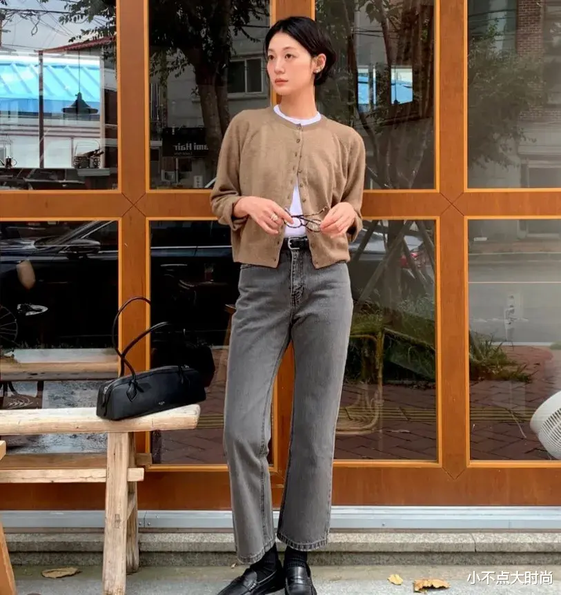 烟灰色的高腰九分直筒牛仔裤搭配浅棕色的短款针织开衫,上短下长优化身材比例很显高,九分直筒裤修饰腿型很显瘦。牛仔的利落和酷感,搭配针织的温柔和复古,整套穿搭刚柔结合,优雅大方,简约又高级。▼