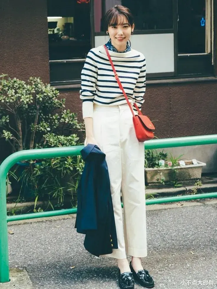 小个子初秋穿高腰九分直筒裤搭配T恤,简约又耐看。条纹T恤经典百搭又时尚,搭配白色的高腰九分直筒裤,清爽又气质,显高很自然。▼