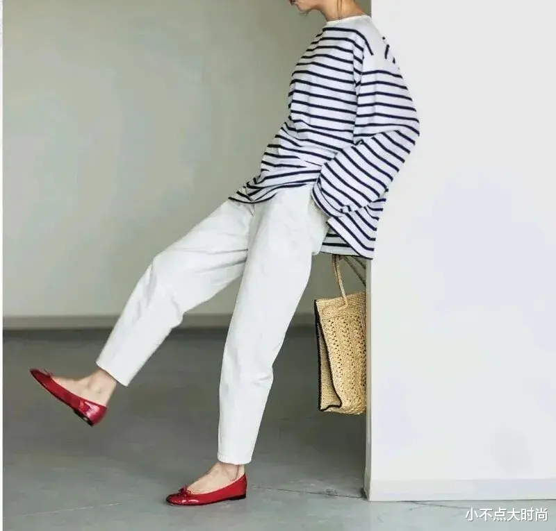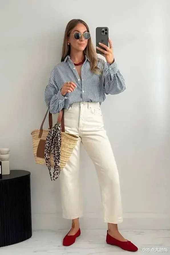 白色的九分直筒裤搭配竖条纹的衬衫,视觉上显高又显瘦。配色干净又气质,简单大方。穿一双小红鞋提亮搭配,瞬间提升时尚感。▼