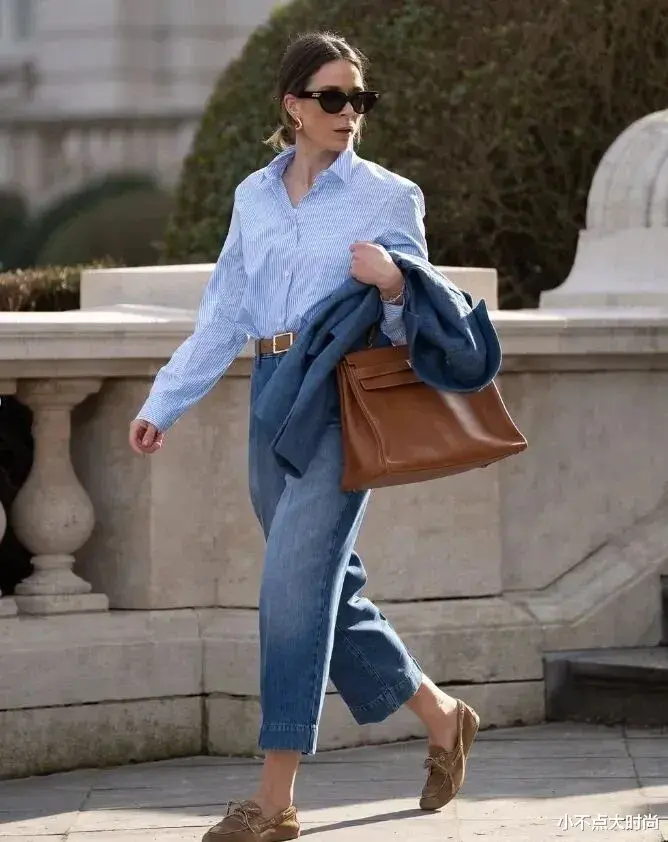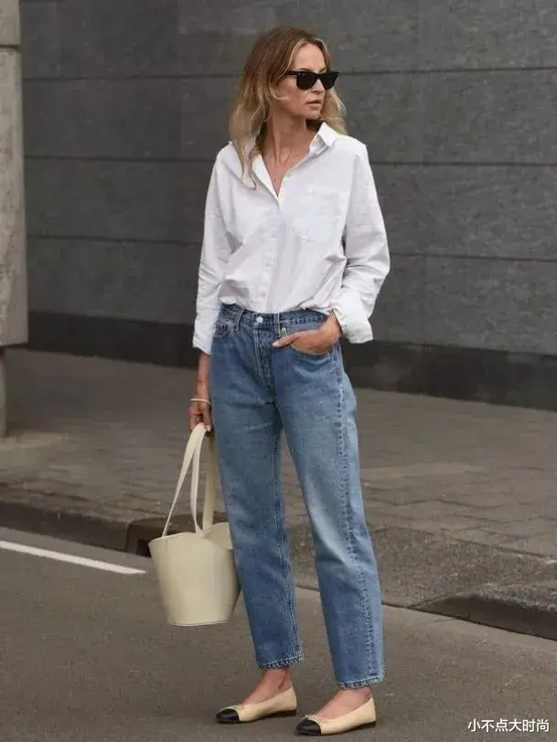 高腰的九分直筒牛仔裤搭配白色衬衫,衬衫下摆收进裤腰内,提高腰线显高利落。整套穿搭简约日常,又得体显气质。▼