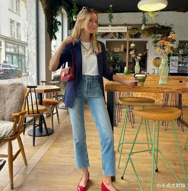 高腰的九分直筒牛仔裤小个子穿显高又显瘦,搭配白色T恤,外搭竖条纹的单西外套,利落又有随性感,时尚大方又气质满满。▼