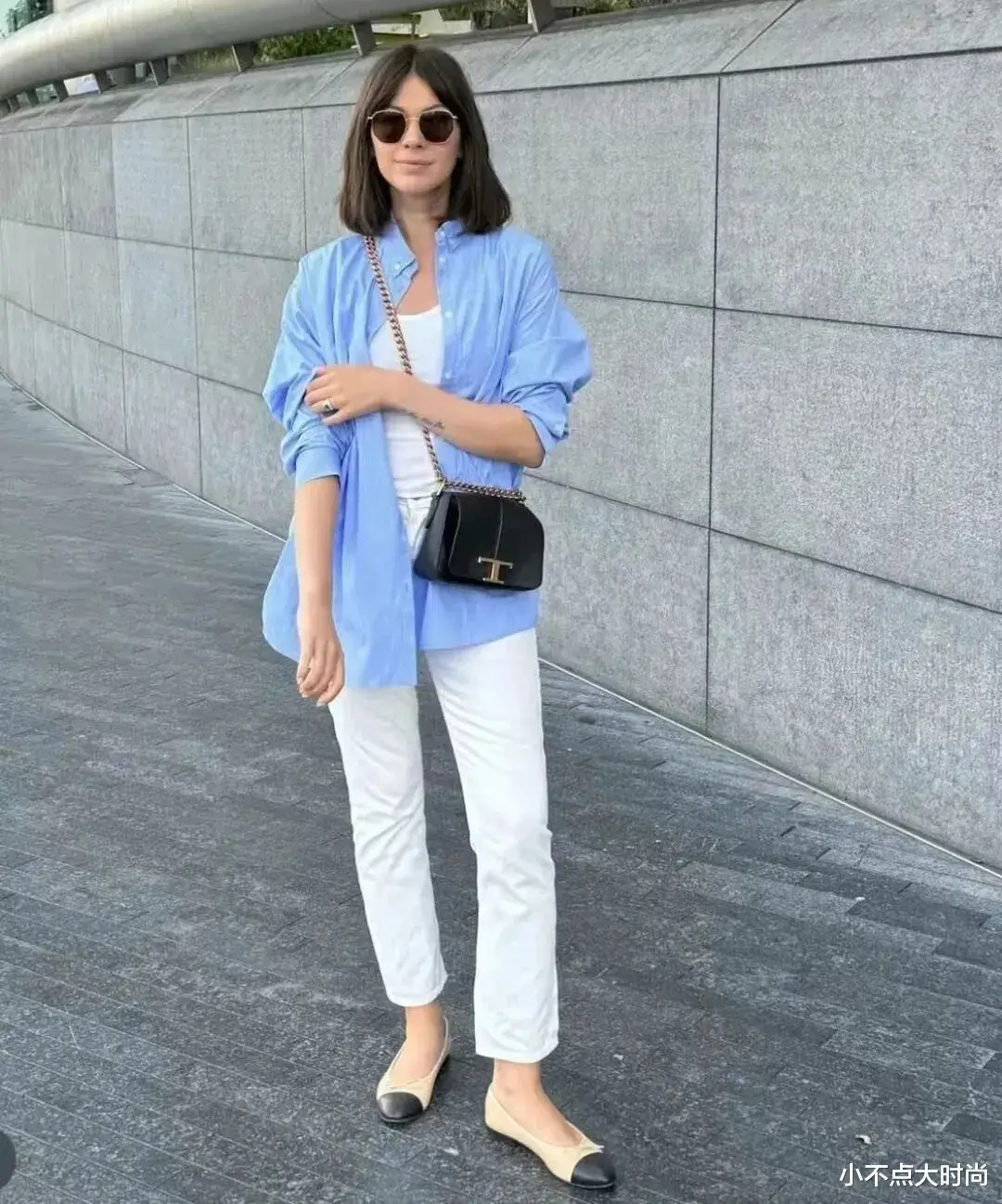 白色的九分直筒裤搭配白色的背心,外搭蓝色衬衫外套,内搭同色系搭配显高又高级,蓝色衬衫清爽随性,为穿搭增添几分休闲和松弛感,时尚耐看又气质。▼