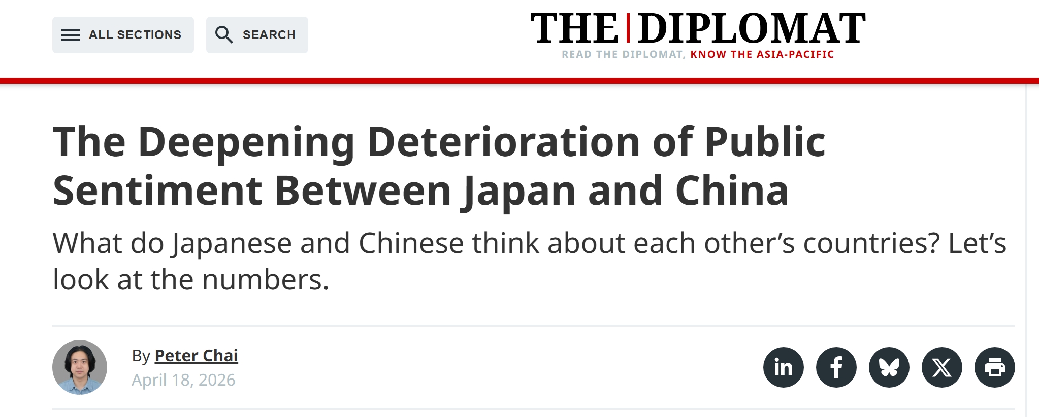 4月18日,就在日本军舰穿越台湾海峡后的今天,全球知名外交杂志《外交家》发表了一篇名为“中日两国公众情绪的持续恶化加深”的文章。这篇文章看似“中立”,实则是向西方读者“洗白”日本,而把脏水往我们身上泼,似乎如今中日关系紧张的局面是我们造成的。