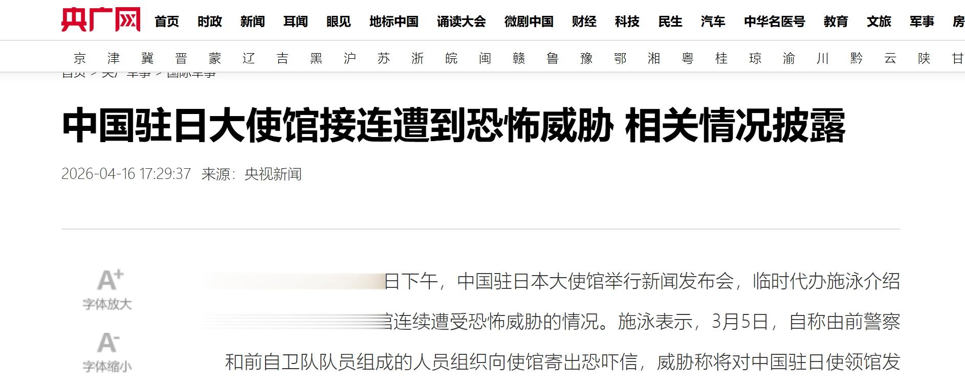 又比如,4月16日下午,中国驻日本大使馆举行新闻发布会,介绍了最近两个月内,驻日使馆连续遭受日本恐怖威胁的情况。