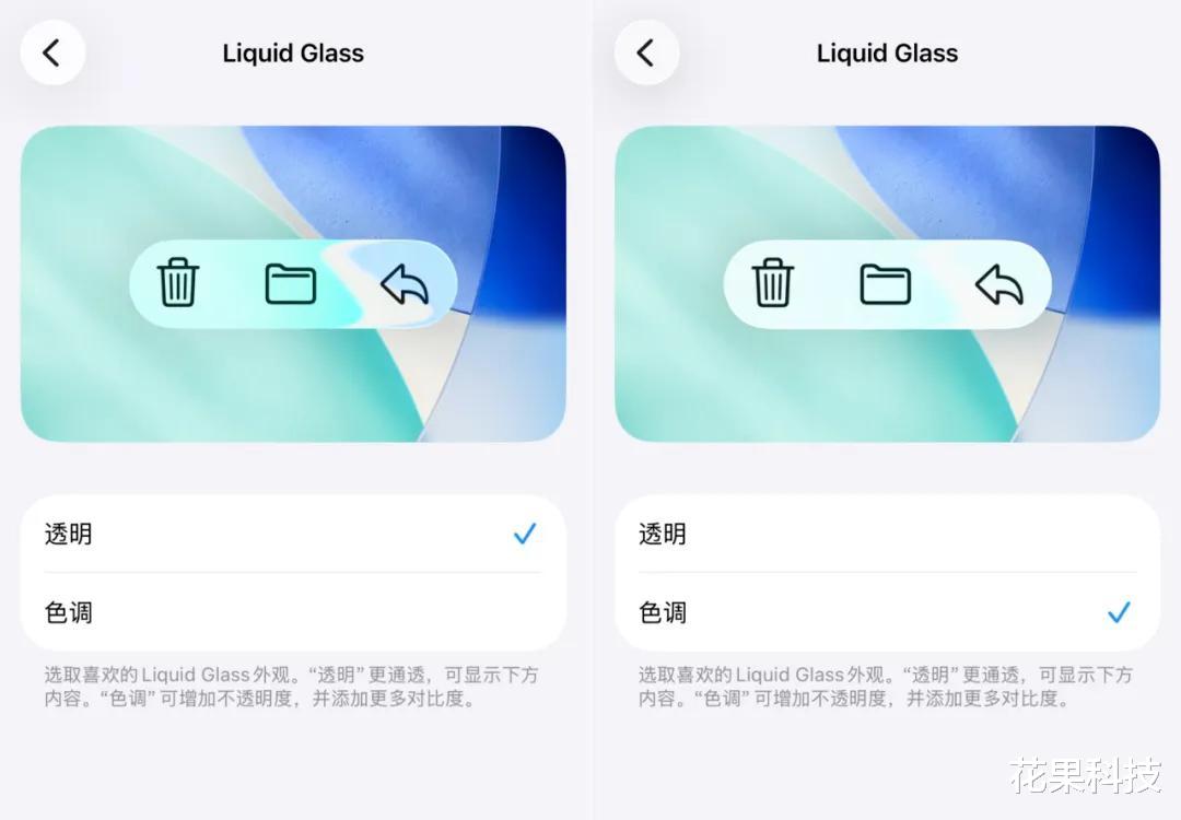 在这里可以选择自己喜欢的液态玻璃外观,选择「透明」那么玻璃效果会更强,更通透。