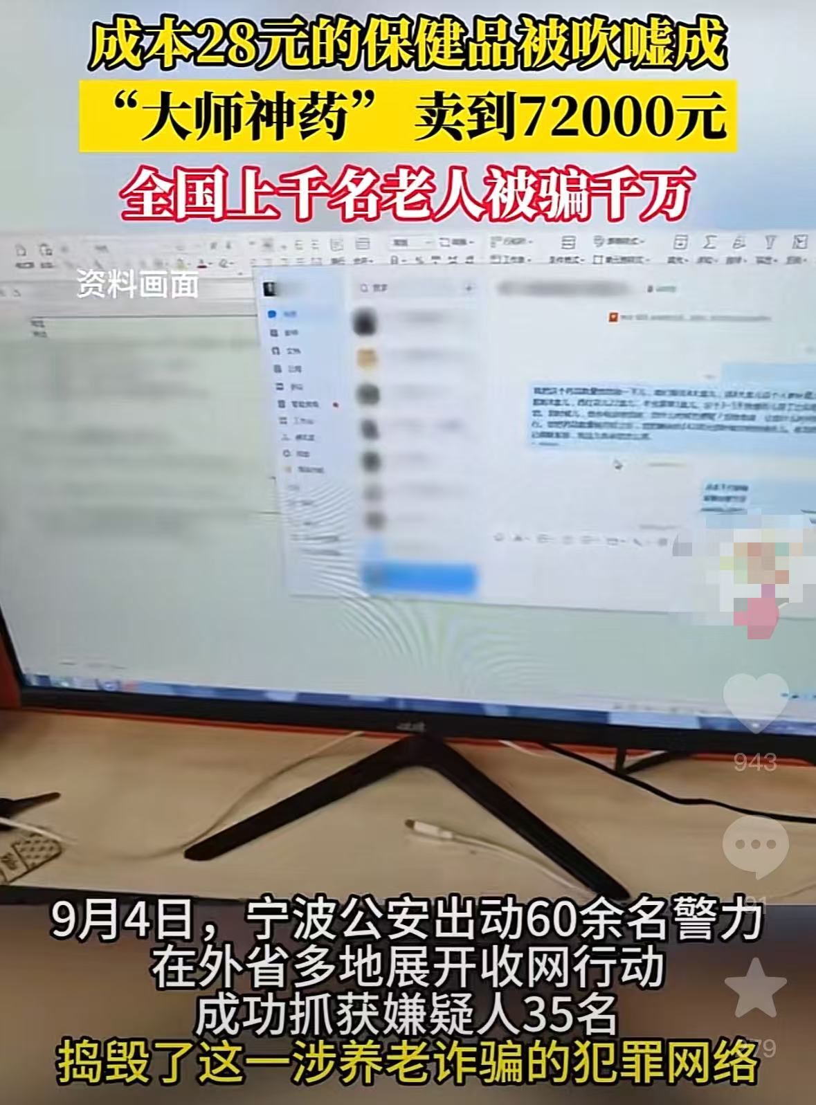 一条精心设计的诈骗链条,让成本仅28元的普通保健品摇身变为售价7.2万元的"抗癌神药"。近日,宁波警方跨省收网,揭开了这个专门针对老年群体的特大诈骗网络。