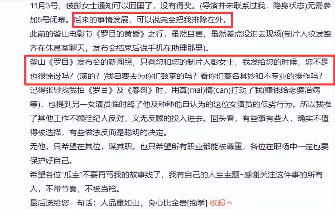 此外,还有之前白百何自费跟随《罗目的黄昏》剧组亮相釜山电影节时,同样也被张律和彭瑾忽视。