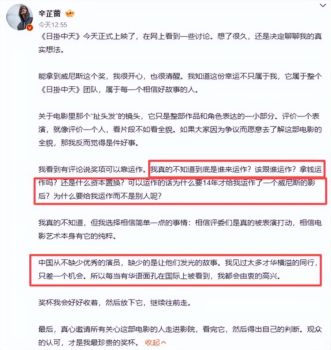 “我看到有评论说奖项可以靠运作。我真的不知道到底是谁来运作?该跟谁运作?拿钱运作吗?还是什么资本置换?可以运作的话为什么要14年才给我运作了一个威尼斯的影后?为什么要给我运作而不是别人呢?”
