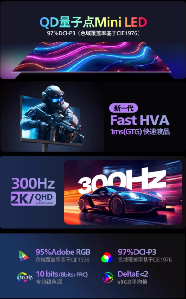其拥有2K分辨率以及300Hz刷新率,配合10bit色深、97% DCI-P3色域和△E<2的专业级色准,能呈现出细节拉满、层次分明的视觉效果,彻底告别普通IPS屏的“灰蒙感”。