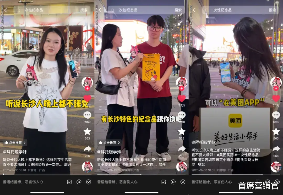 抖音:美团买药和杰士邦合作拥有超300万粉丝的街头采访博主@拜托啦学妹 ,在凌晨3点走上长沙街头,向仍然沉浸在夜生活的“夜猫子”送上长沙城市限定安全套,不管是单身的好兄弟,还是吵架的小情侣,都可以瞬间get这份礼物的内涵,“一次性纪念品”双关梗在轻松互动中得到了传递。