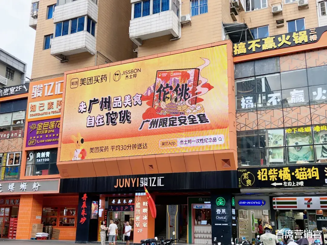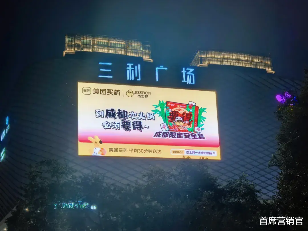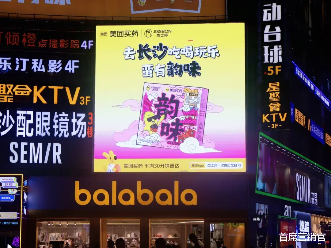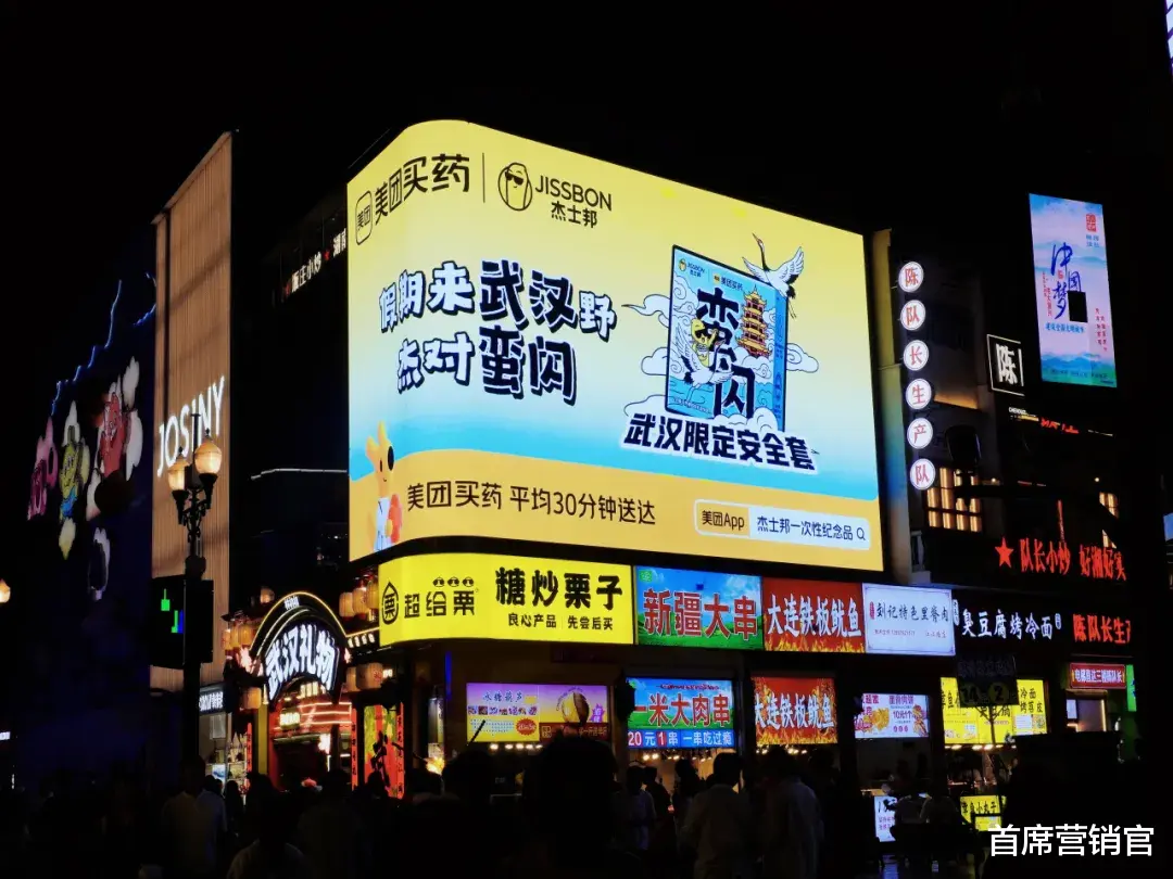 此外,美团买药和杰士邦还进一步深入线下渠道,在上海、广州、成都、杭州、长沙、武汉、郑州七个城市的核心商圈大屏投放了户外广告,不仅呼应了杰士邦限定款安全套的方言城市,还真正渗透到了用户国庆出游的现实场景,提升了整个传播的活人感和烟火气。