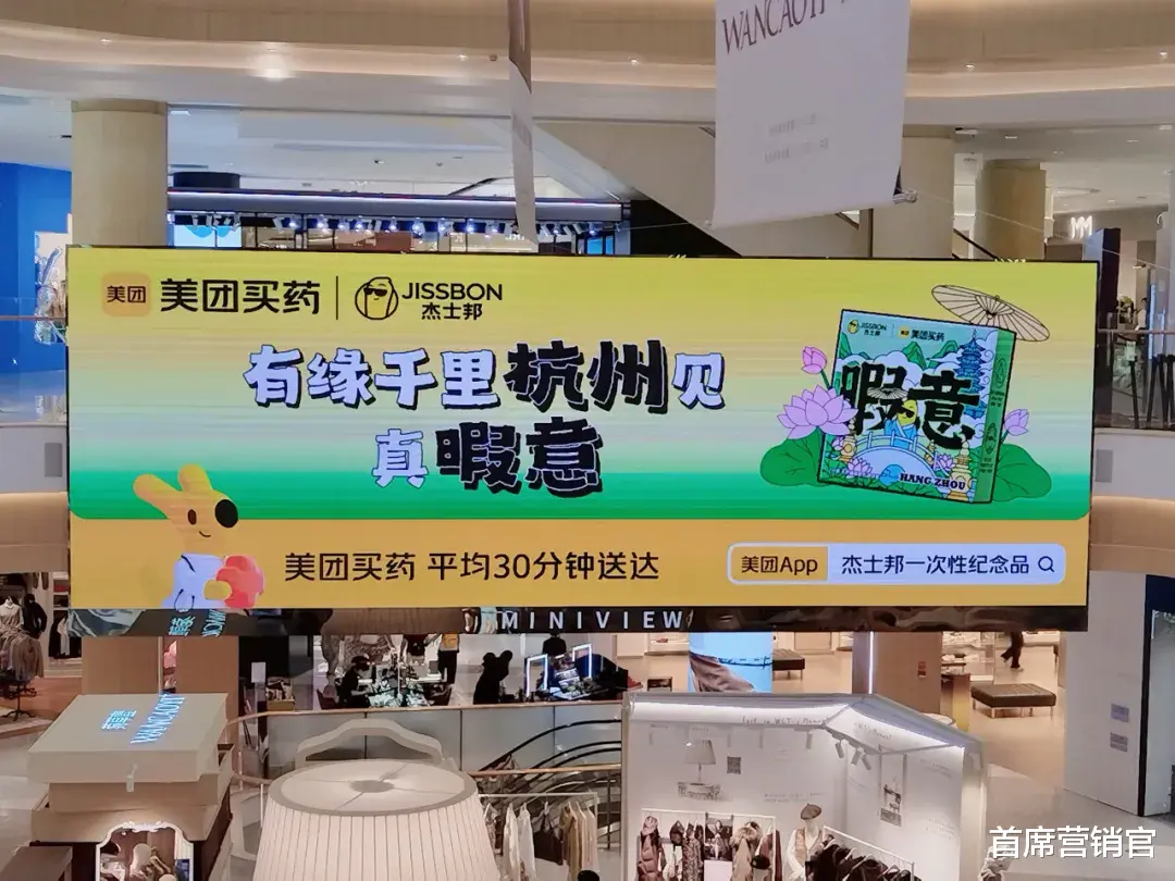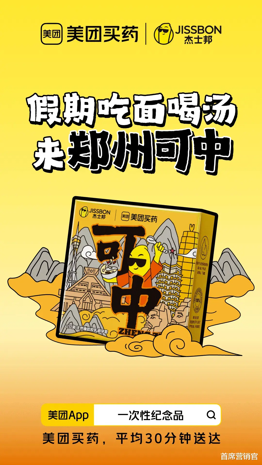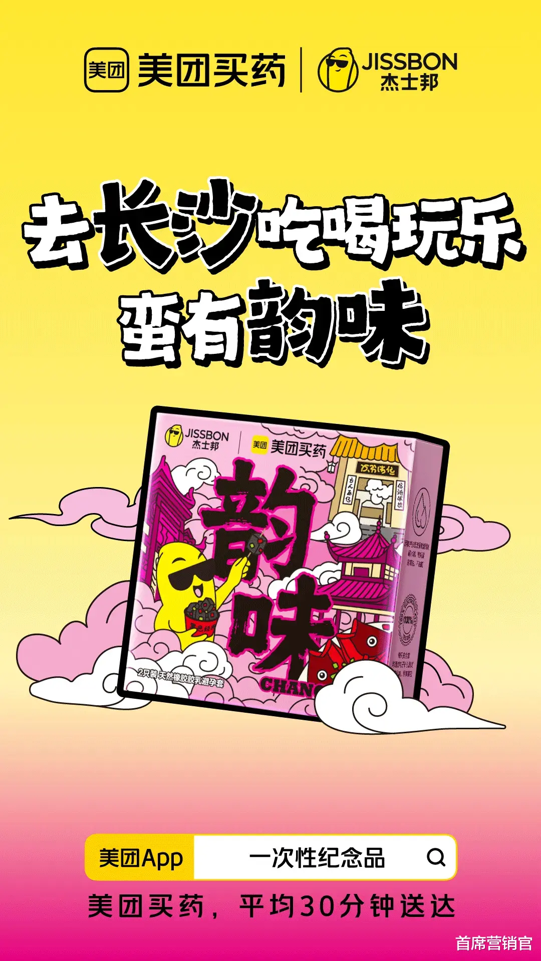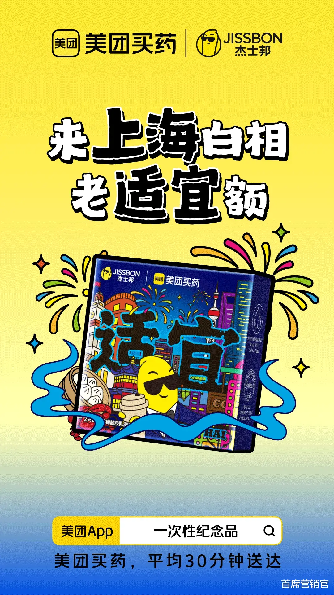 好创意也得会吆喝。传播渠道上,美团买药和杰士邦搭建了一套从线上到线下的传播组合拳,让这个国庆假期到处飘着“一次性纪念品”的梗。