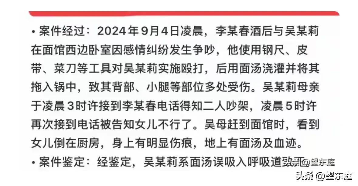 想离没有离成的婚姻事实上,悲剧发生前吴某莉也曾提过离婚,可最终因为种种原因没有离成。值得一提的是,被灌面汤离世前不久,她的手就曾被李杨春打骨折了。