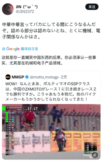 日本网友在评论中多次表示了不可思议,祝贺张雪夺冠的同时,对“中国制造”十分认可,虽然在此之前并未了解,但也被实力打动。