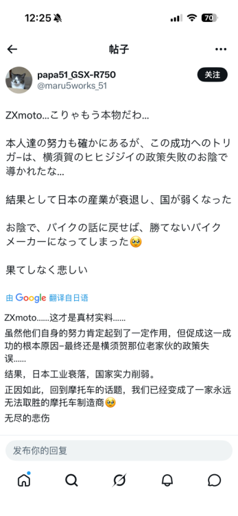 网友papa51_GSX-R750:ZXmoto才是真材料.....虽然他们自身的努力肯定起到了一定作用,但促成这一成功的根本原因最终还是那位老家伙的政策失误,结果,日本工业衰落,国家实力削弱。回到摩托车的话题,我们已经变成了一家永远无法取胜的摩托车制造商。无尽的悲伤。