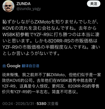 日本网友ZUNDA:说来惭愧,我之前并不了解ZXMoto,但他们似乎是一家效仿KOVE的公司。去年他们在WSBK首秀中就击败了YZF-R9,这真是令人惊叹。更何况,820RR-RS的零售价只有YZF-R9的一半左右。简直不可思议。