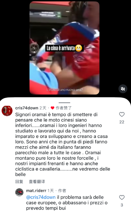 意大利网友cris74down:兄弟们,是时候摒弃对中国摩托车的偏见,别再觉得它们低劣了。现在的中国工程师都曾在我们这儿深造历练过,学成归国后,他们已经开始自主研发和创造了。这么多年,他们一直脚踏实地地造车,说实话,作为意大利人,我很担心这些车会给所有传统大厂造成巨大冲击。看看现在,他们不仅用上了我们品牌的减震和刹车,在车架调校和动力性能上也已今非昔比………好戏还在后头呢。
