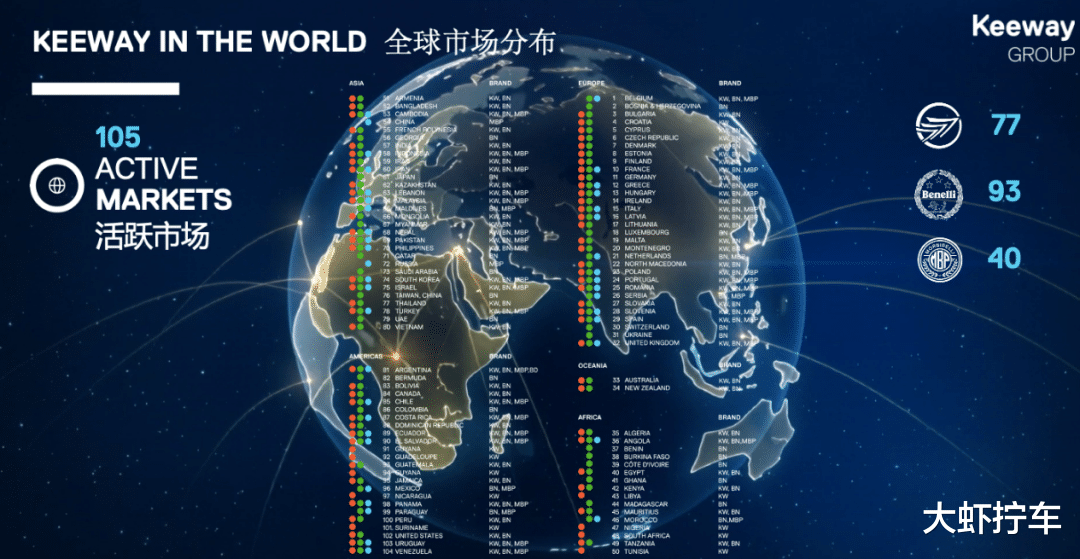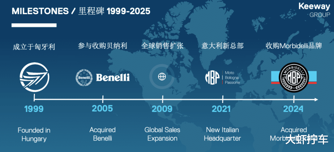 凯威(Keeway):1999年由中国人成立于匈牙利的一家公司,是一家跨国摩托车集团,拥有广泛的全球销售网络,同时他也是意大利贝纳利品牌中国收购方之一(另一家是钱江)。