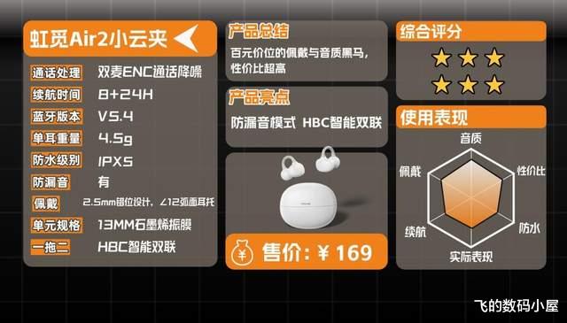 性能配置上,虹觅 Air2 小云夹也不含糊。左右耳搭载双芯片,支持 HBC 智慧双联功能,两台设备可分别连接左右耳机,实现独立使用;5.4 版本蓝牙芯片则进一步提升了传输稳定性,让耳机的综合表现更可靠。此外,它还配备了自研防漏音模式,能自动捕捉泄露的声音信号,再通过反向声波抵消技术减少漏音问题,在百元价位里,性价比优势十分突出。