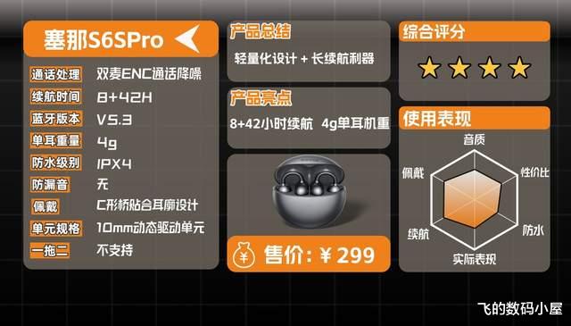 第五款耳机是塞那S6SPro,单耳重量仅 4g,上耳后几乎无存在感。耳机的 C 桥部分采用高回弹硅胶材质,触感柔软且耐用性强;同时,镍钛合金材质的耳夹兼具良好柔韧性与形状记忆功能,能根据不同人的耳廓形状自适应调整,稳定性好。