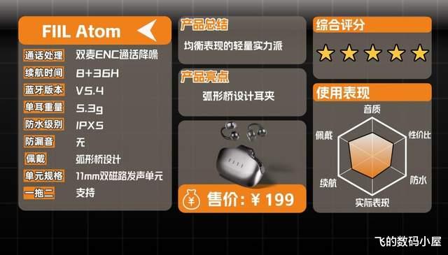 第二款耳机是斐耳Atom,这款耳机在佩戴体验上表现出众。单耳仅重 5.3g,长时间佩戴耳朵也不累耳。其采用记忆钛合金丝与 Ω 弧形桥设计,能让耳机稳稳地固定在耳朵上,动作大些也不会掉。