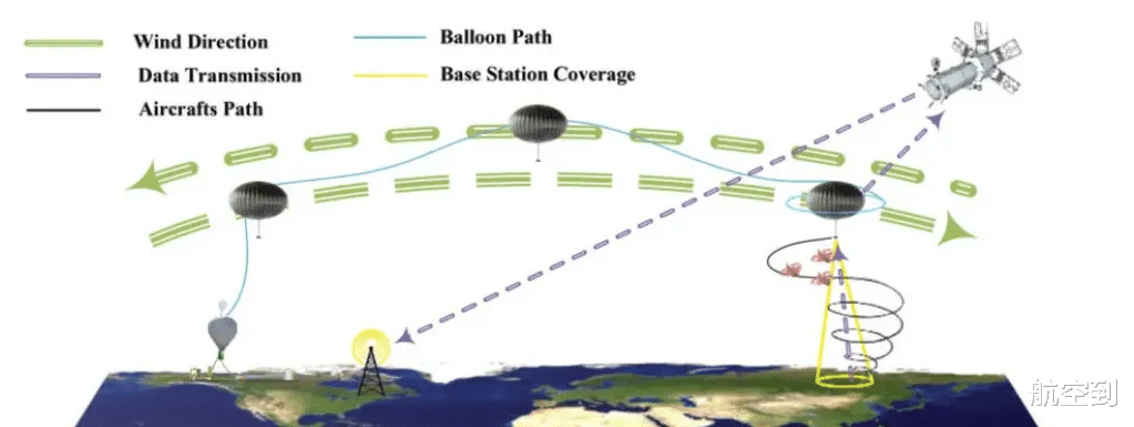 一幅大致描绘了通过高空气球部署无人机,然后利用卫星将信息中继传送到一个控制节点的概念图。