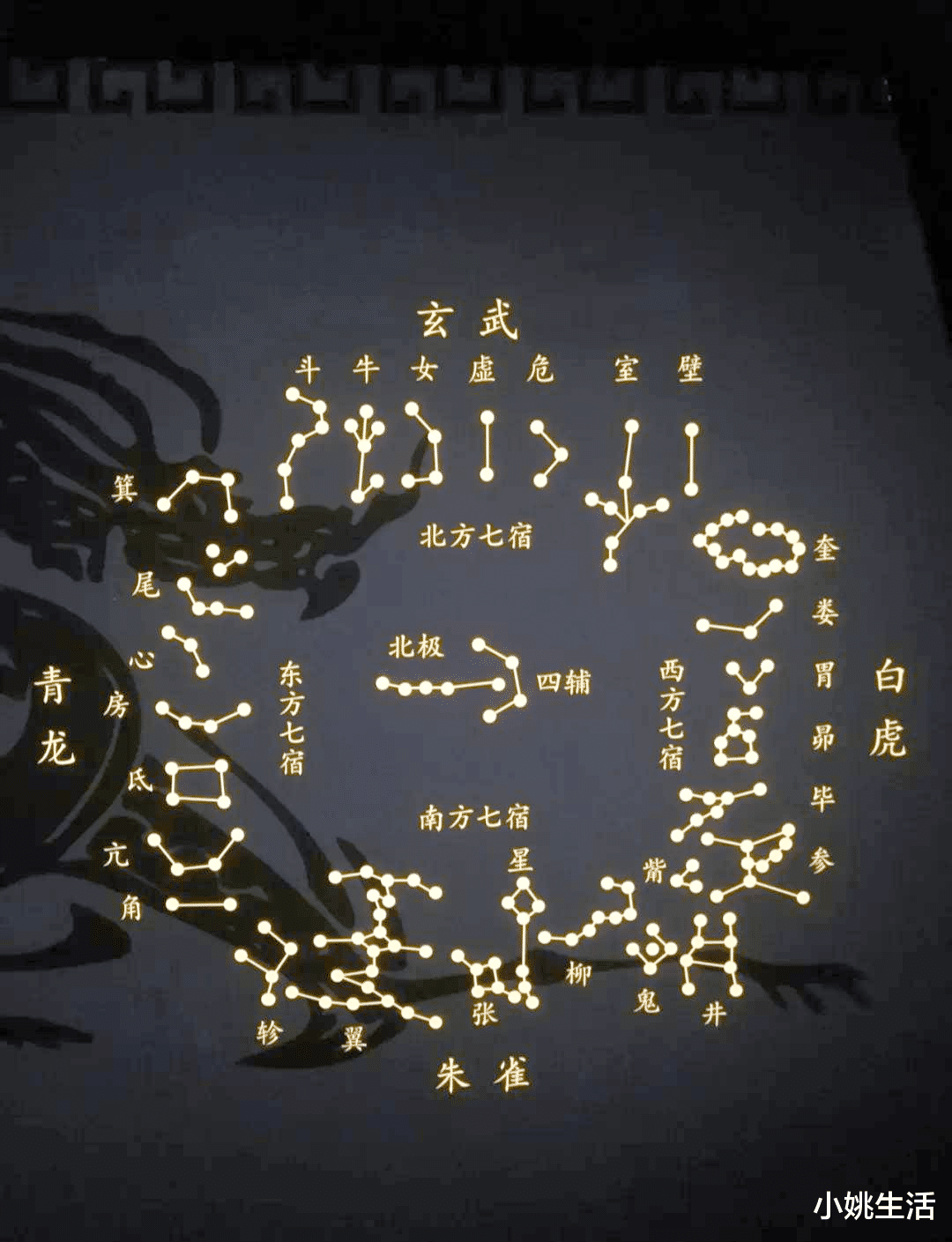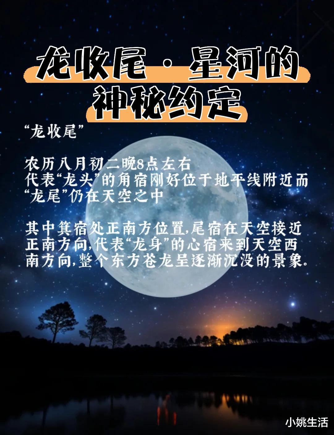 古人把黄道附近恒星分成二十八宿,每七宿成象——东方之神即为“苍龙”。春有“龙抬头”,夏见“飞龙在天”,而秋日的“龙收尾”宣告收获季节正式到来:龙头(角宿)已没入夜色,只剩龙身与龙尾高悬,像给天空写下最后一笔草书。