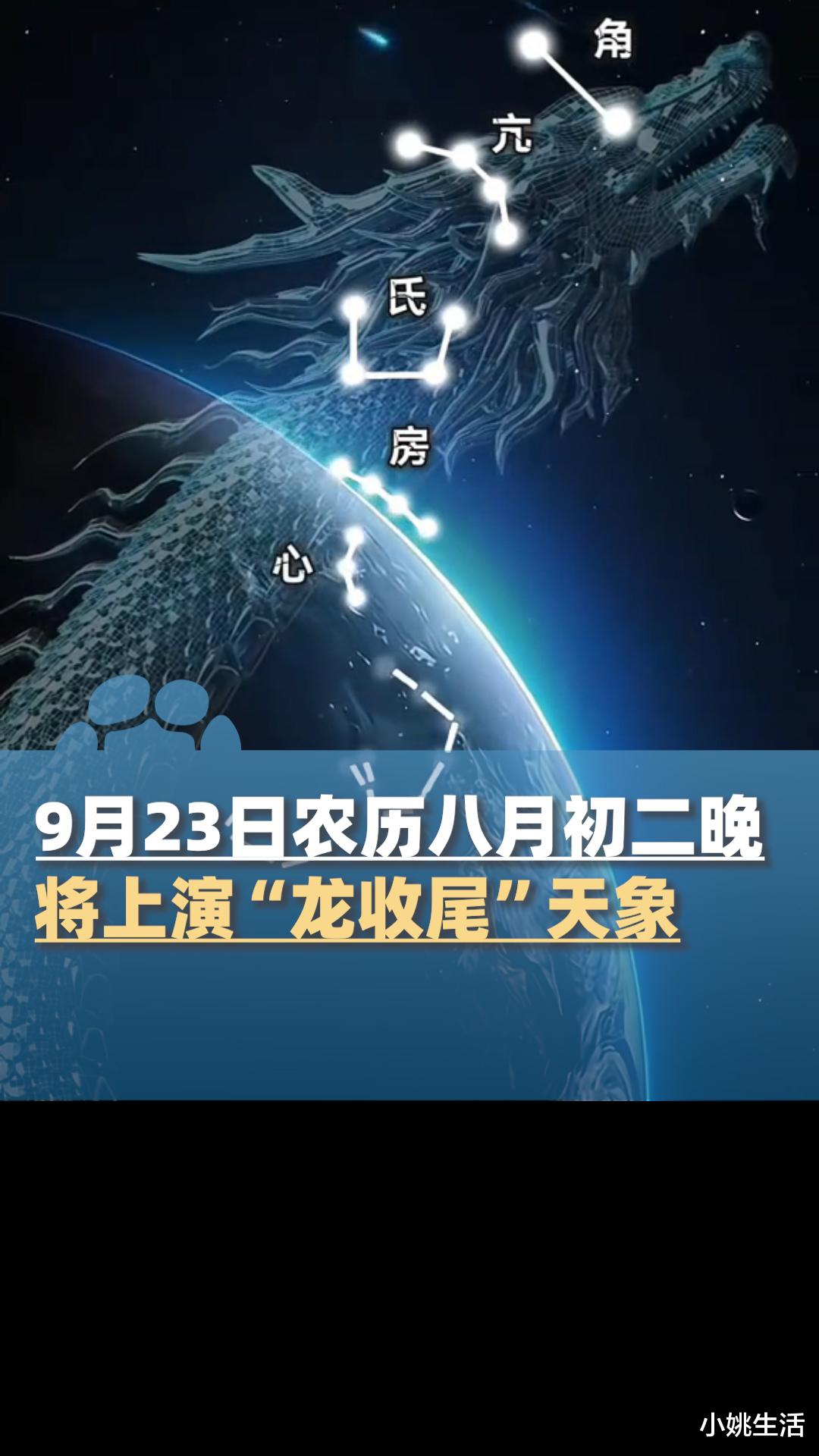 9月23日(农历八月初二)20:00,抬头向西南看:一条由恒星连成的巨龙正缓缓沉入地平线,这就是年度重磅天象“龙收尾”。