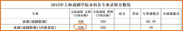 2013年,上戏影视表演专业再次大批招收内蒙古委培生时,内蒙古考生们发挥得不错,文科分数线为230分,比普通考生分数线226分还多了4分。