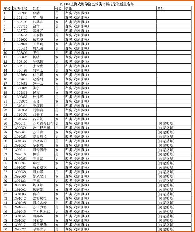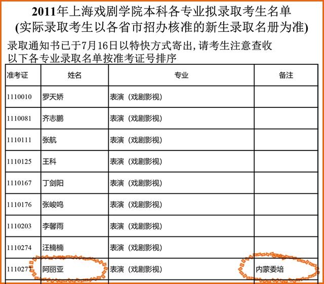 2011年的录取考生名单就能找到了,这一年影视表演专业仅招收了一位内蒙古委培生。