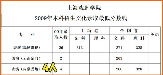 二、招生数量浮动大因为年代久远,笔者并未在上戏招生网上找到2009年的录取考生名单,但“分数线表”显示这年招了4名内蒙古委培生。