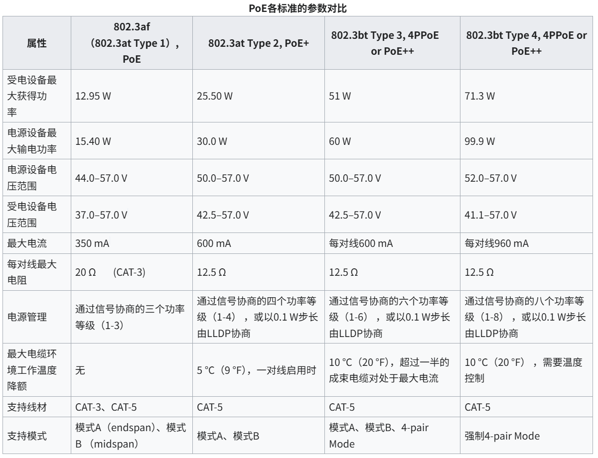 值得一提的是,早在标准出台前,Cisco 等厂商就有过非标准的 PoE 实现,例如旧式 Cisco 交换机每端口仅提供约 10W 的功率,并通过 Cisco Discovery Protocol 协商功率需求。这些非标准方案在 802.3af/at 出现后已逐渐被淘汰或者兼容更新的标准协议。总体而言,PoE 标准演进形成了一个功率等级体系,从最早的 15.4W 逐步提升到近百瓦的级别,以满足物联网、安防、办公自动化等日益增长的用电需求。