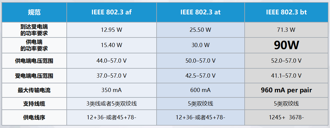 IEEE 802.3af(2003):最初的 PoE 标准,也称为PoE Type 1,PSE 每个端口可提供最高 15.4W 的直流电功率。由于网线有传输损耗,受电端设备(PD)最多可用大约 12.95。该标准要求使用至少 Cat5 线缆以支持上述功率水平。