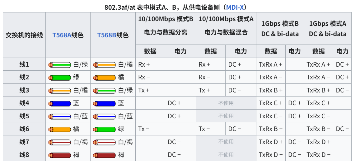 工作原理:PoE 利用以太网线对中的共模信号来传输电力。在两对供电模式(A 型和 B 型)中,模式 A 将电力与数据同时加载在数据线对(引脚1、2和3、6)中,类似话筒幻象电源技术,通过共模电压传输电力而不干扰数据信号;模式 B 则使用备用的线对(引脚4、5和7、8)单独传输电力。采用任何一种模式时,只要 PSE 和 PD 都支持即可正常供电。PoE 针脚与数据分配如下图。