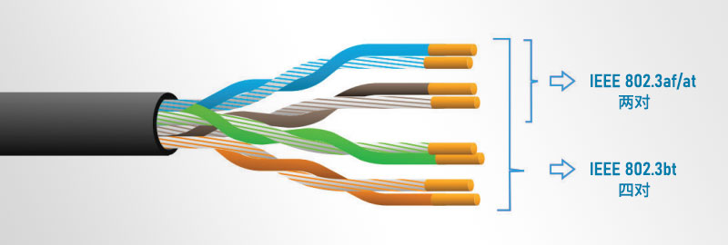IEEE 标准允许 Cat5/Cat5e 或更高等级的双绞网线用于高功率场景,而对于功率需求较低的应用,也可以使用 Cat3 等老旧线缆。PoE 在布线时需要注意总长度一般不超过约100米,以保证末端设备至少可获得大约44V 的电压,IEEE 802.3 af/at/bt协议规定,标准的PoE端口输出电压范围是44-57V之间。